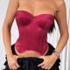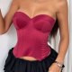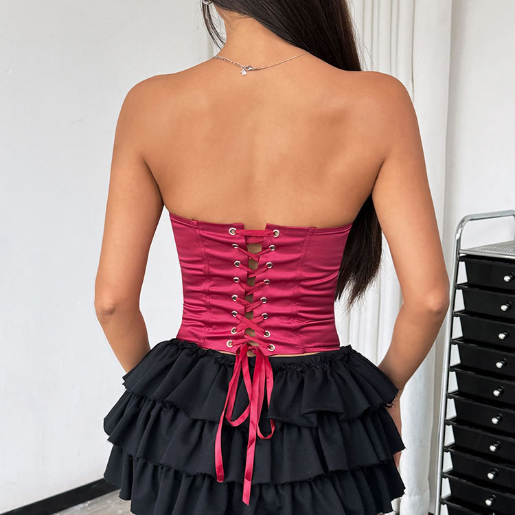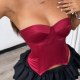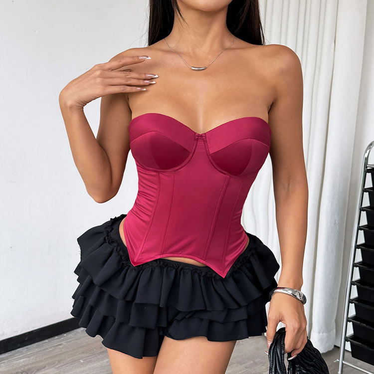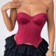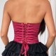 Turn heads with this vibrant magenta corset top, designed to celebrate your curves. Featuring a classic sweetheart neckline and molded cups for support and shape, this strapless bustier offers a flattering silhouette. Vertical seams create a structured look that cinches the waist, while the smooth, solid-color fabric provides a sleek finish. The back is detailed with a functional lace-up closure using matching magenta ribbon and silver-toned eyelets, allowing you to adjust the fit to your liking. Pair it with high-waisted jeans, a skirt, or shorts—like the tiered ruffle mini shown—for a confident and stylish outfit perfect for dates, parties, or nights out.