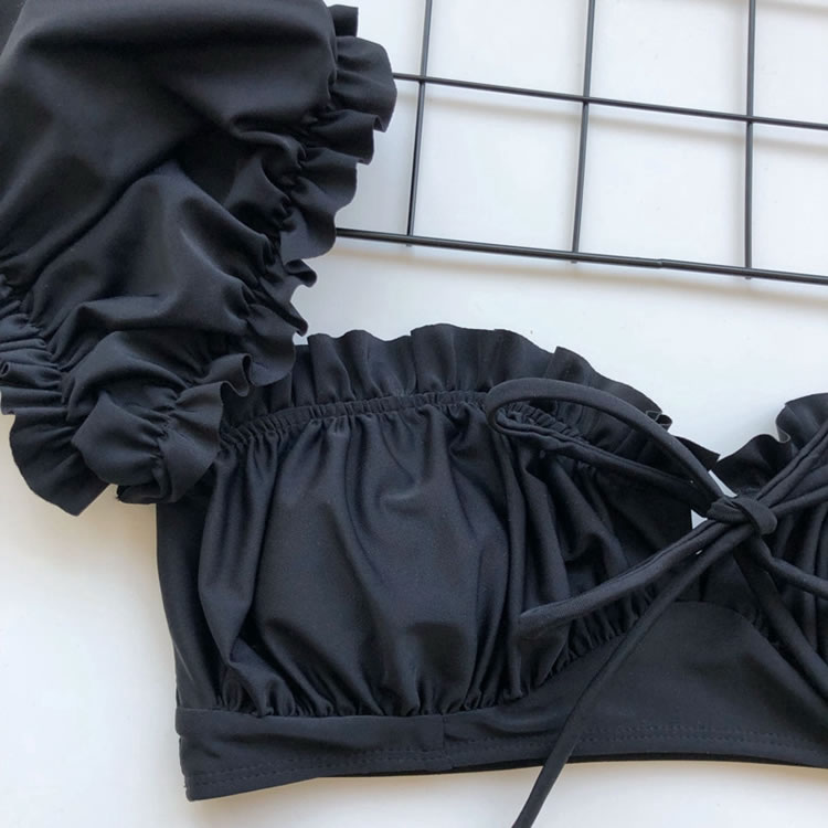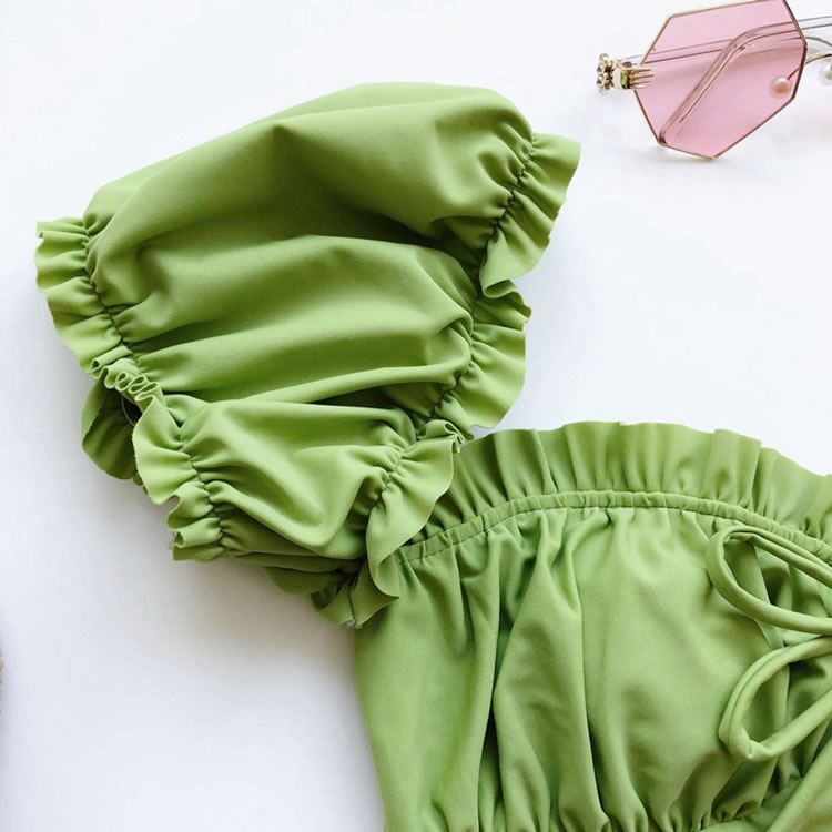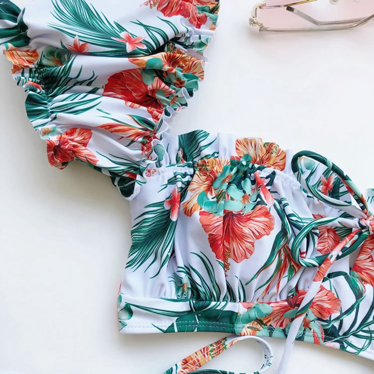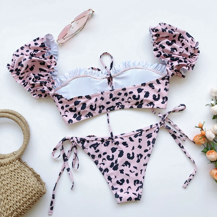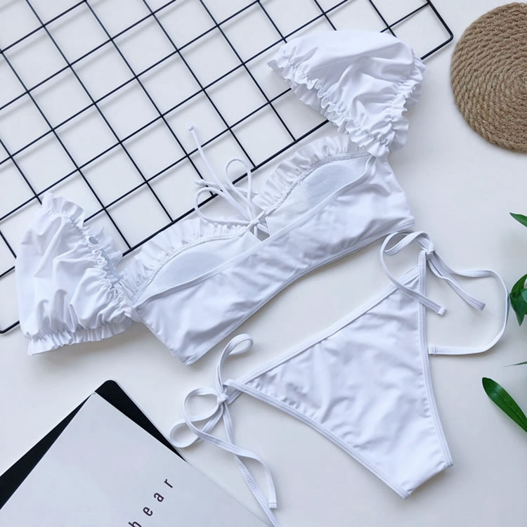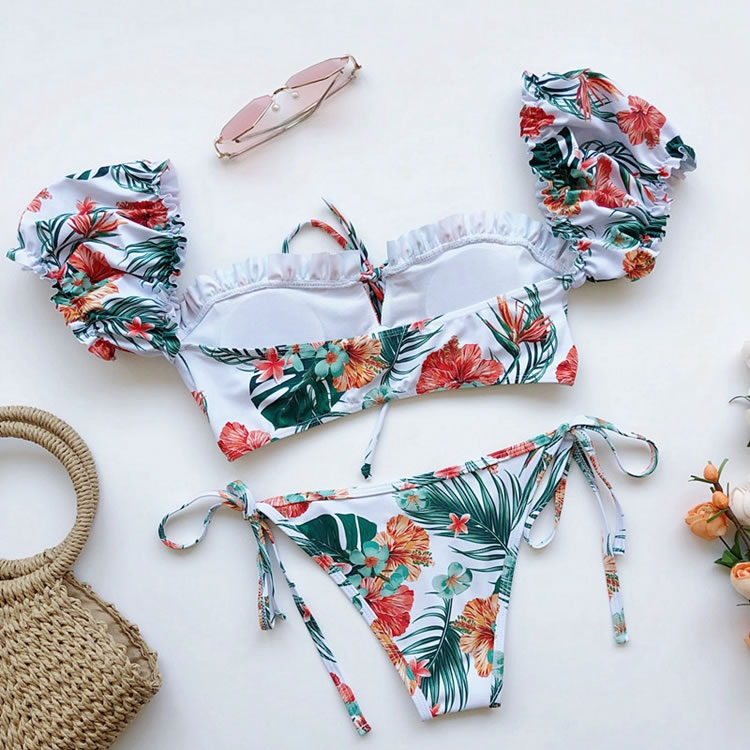 Bring a romantic look to the beach in this exclusive bikini set featuring a soft cups with front tie closures, a straight neckline, off-the-shoulder sleeves, and a matching bottom with tie sides, and a cheeky cut back.