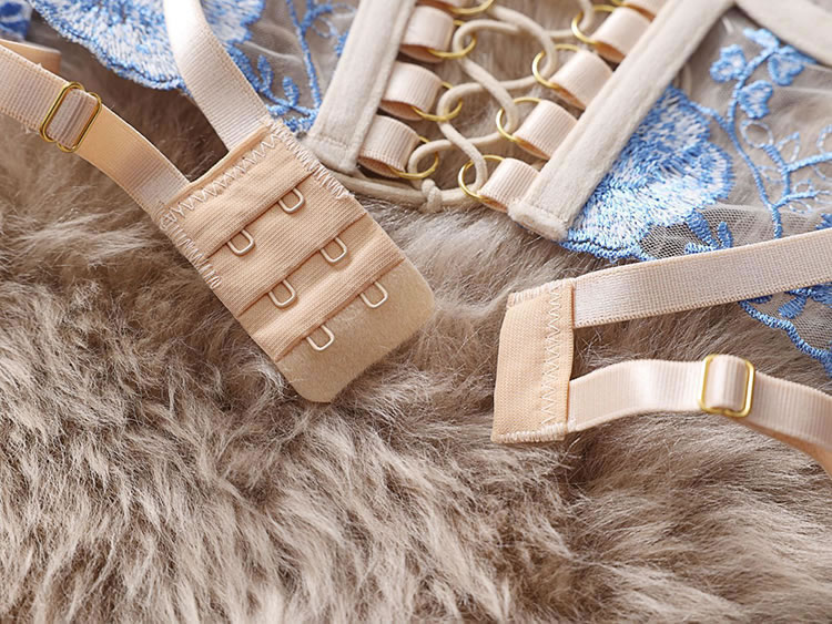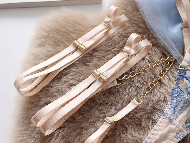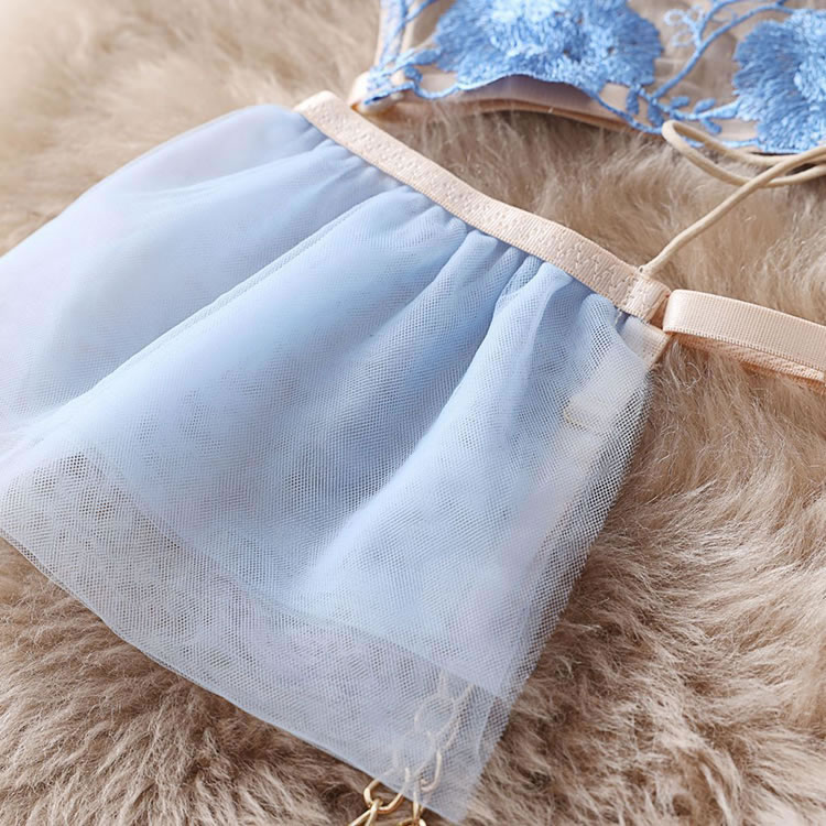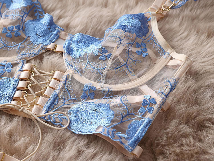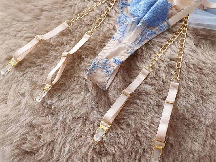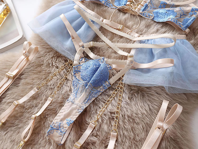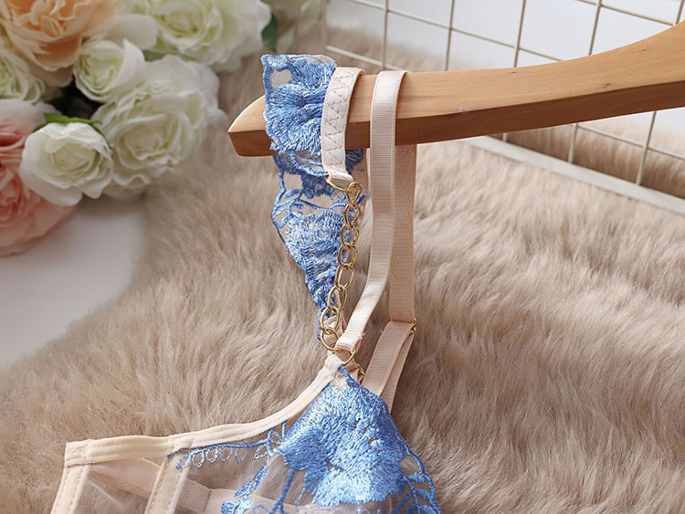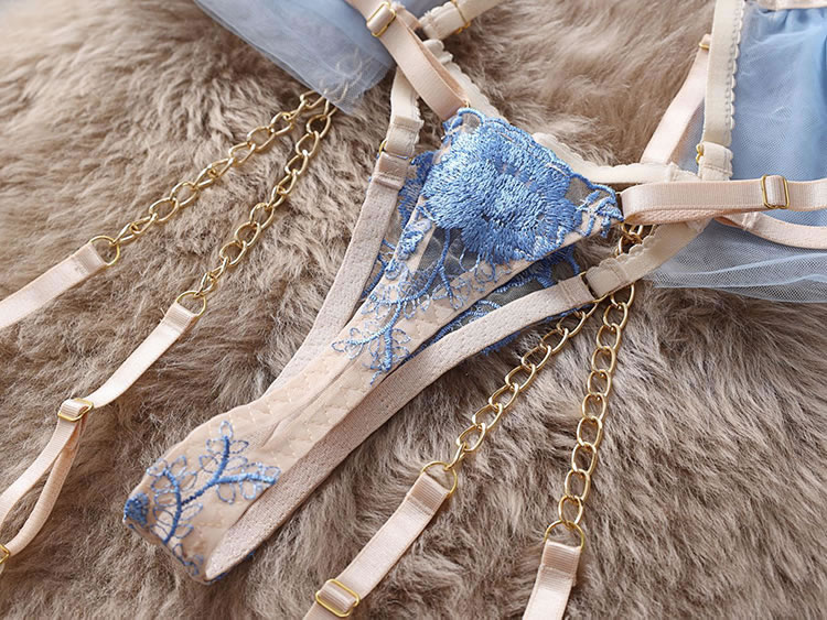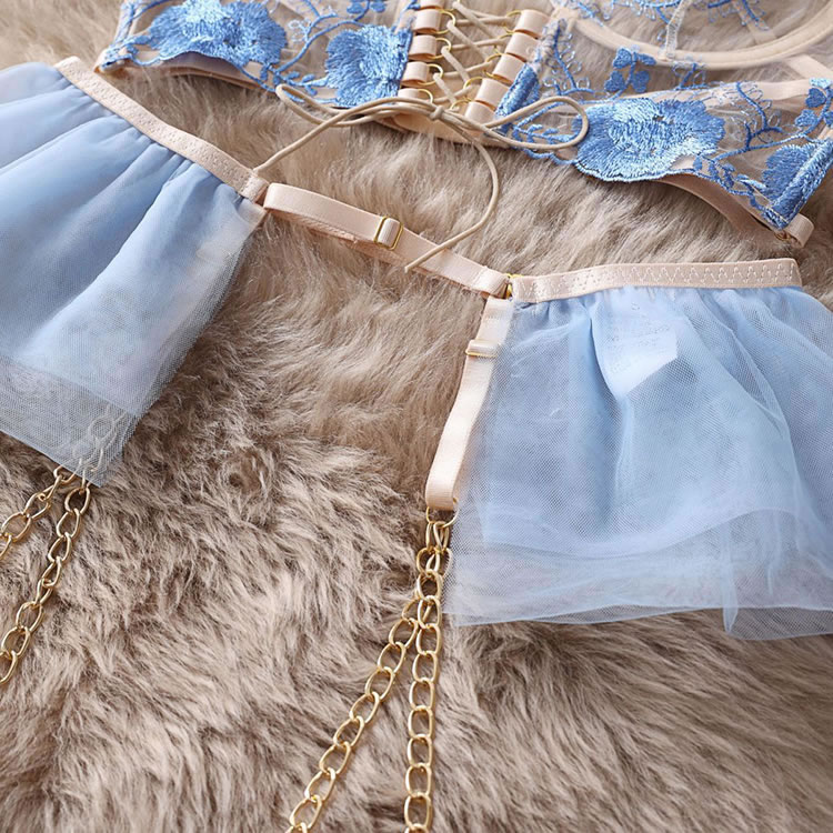 This ethereal lingerie set features delicate blue floral embroidery on sheer fabric, accented with elegant gold chains and a corset-style lace-up front. The structured bra, matching garter belt, and thong, adorned with tulle side panels, create a breathtakingly romantic and luxurious look. Perfect for special, unforgettable moments.