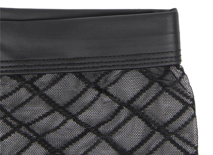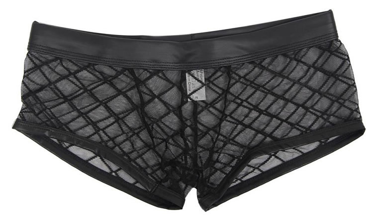 This fun Collection panty features a sheer geometric patterned mesh, a faux leather stretchy waistband, and a full back.