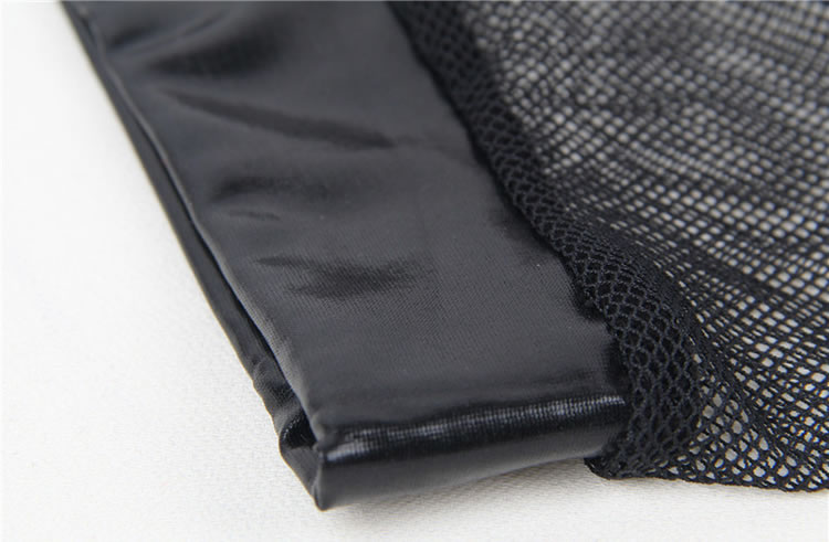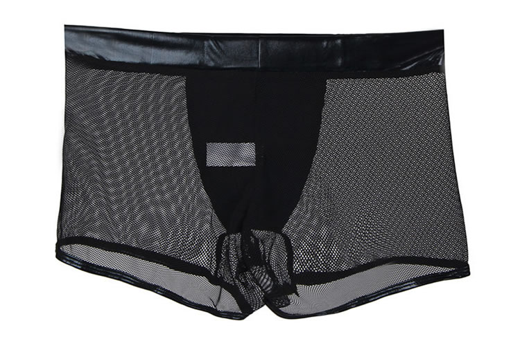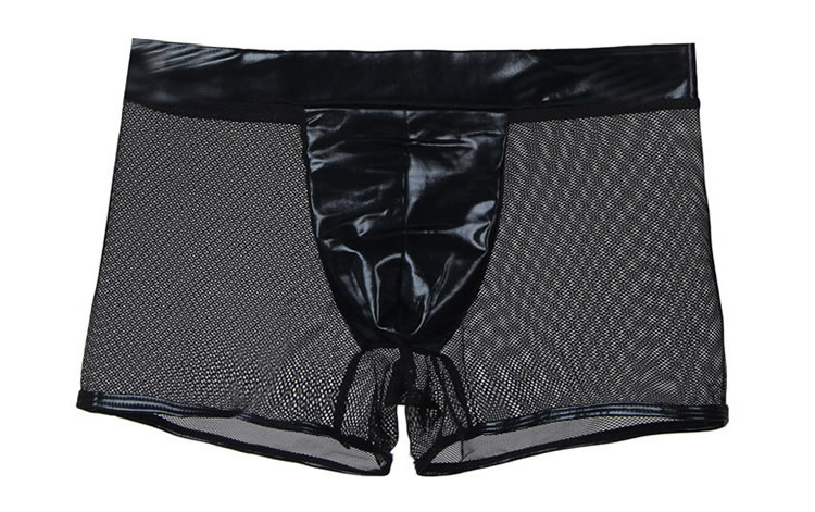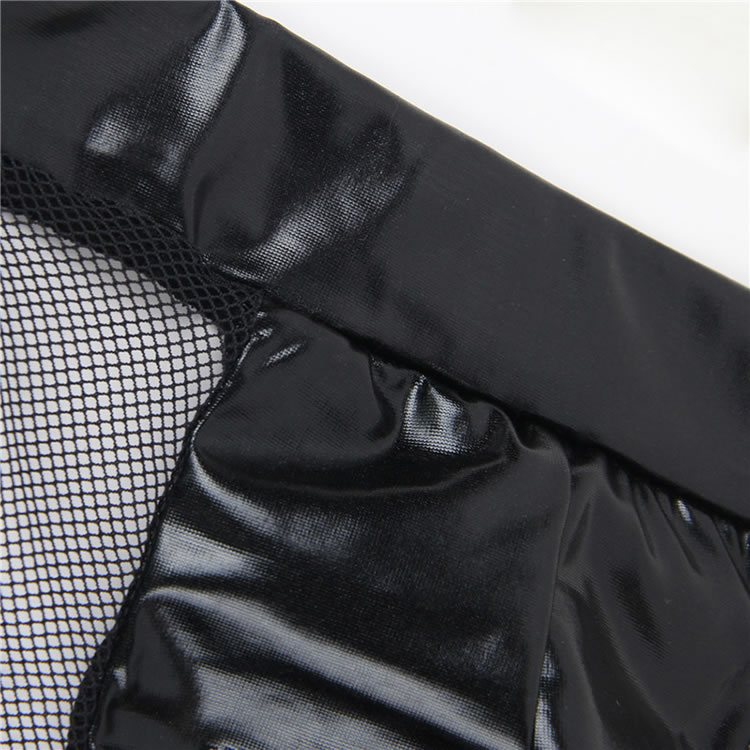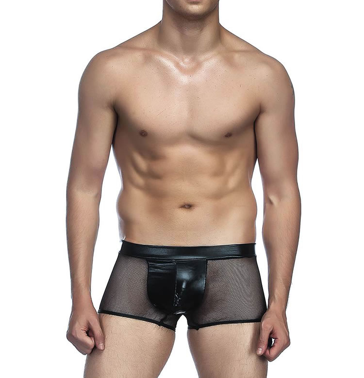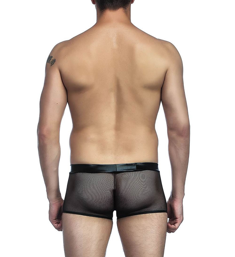 Feel frisky in these sexy exclusive boyshort featuring a faux leather crotch panel, mesh sides and back, and a full back.