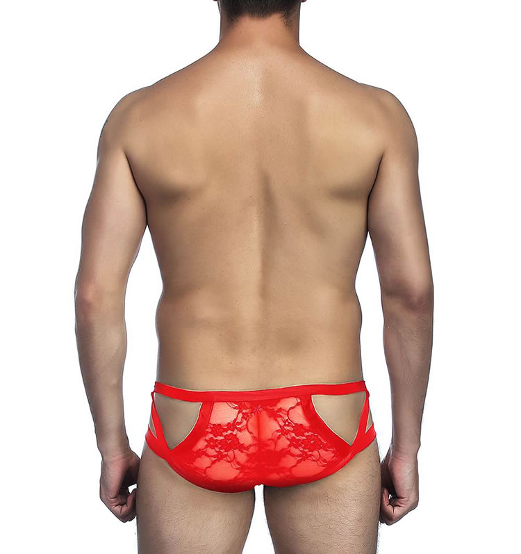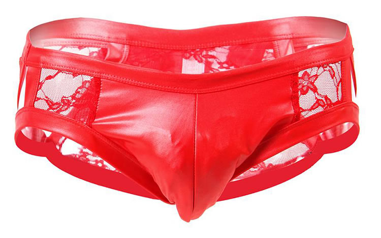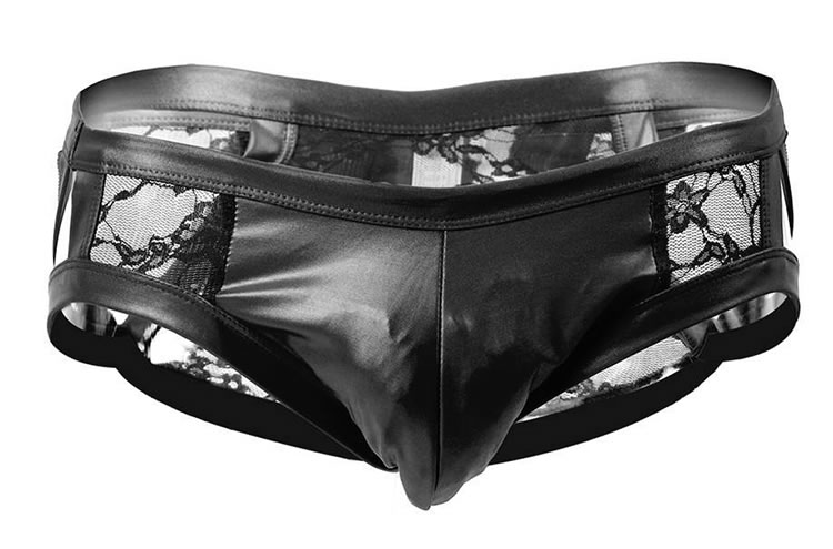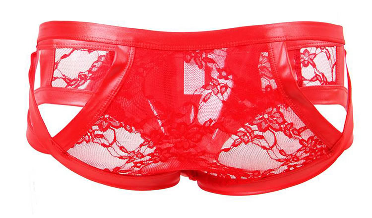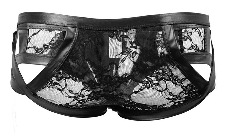 Feel frisky in these sexy exclusive panty featuring a faux leather crotch panel, strapped side panels, sheer lace back, and a cheeky cut back.