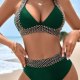 Stand out in this bold black bikini set adorned with gold chain detailing. The halter neck top and high-waisted bottoms feature intricate chains that add a touch of edginess and style. Perfect for those who want to make a statement at the beach or poolside.