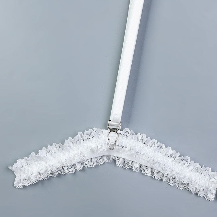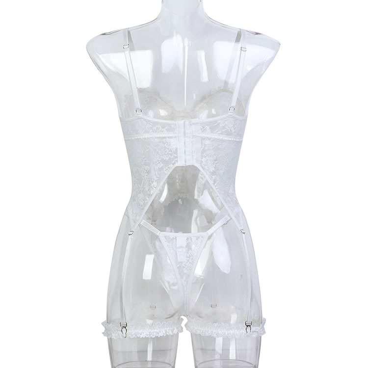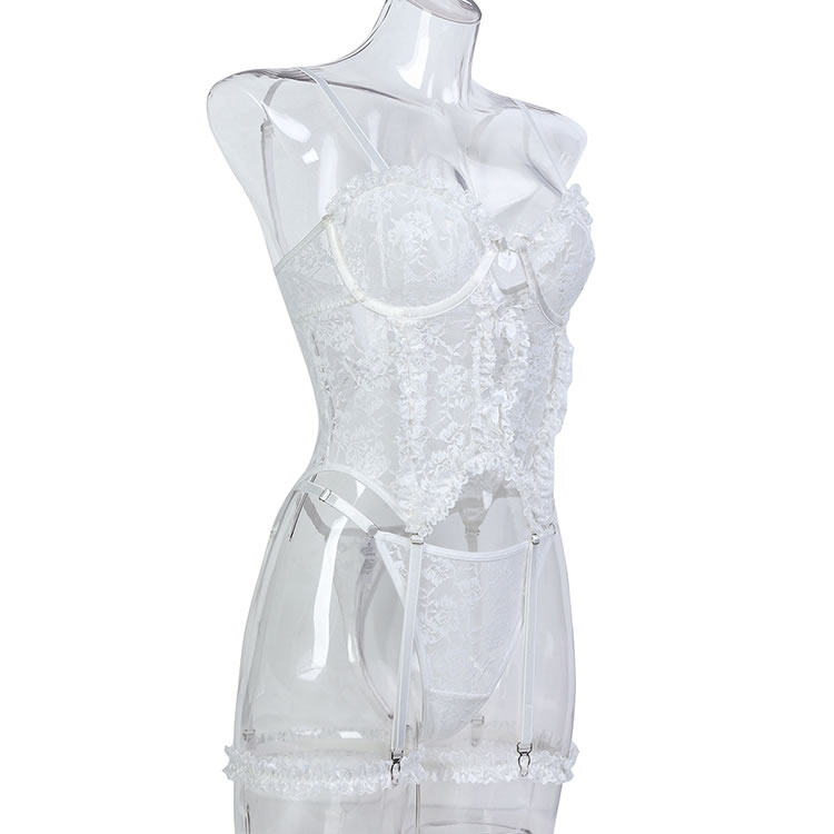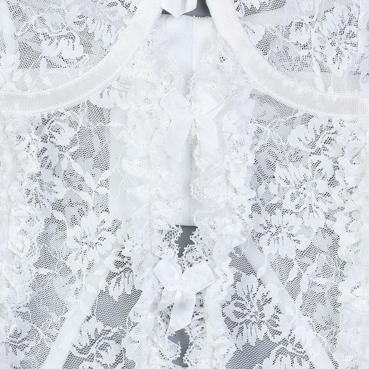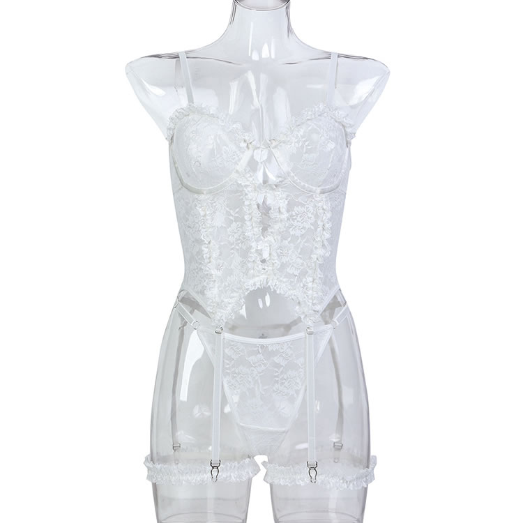 Accentuate your alluring curves in this flirty bustier set, designed with sheer lace underwire cups featuring delightful ruffled detailing and sweet bow accents. The adjustable spaghetti straps and hook-and-eye back closure provide a customizable fit, while the front keyhole opening adds a touch of playfulness. With a sheer bodice, adjustable garter straps, and wraparound leg garters, this set is finished with a matching thong panty for a stunningly seductive look.