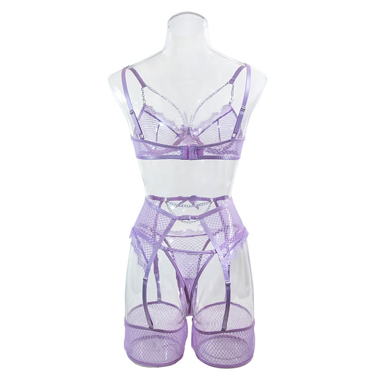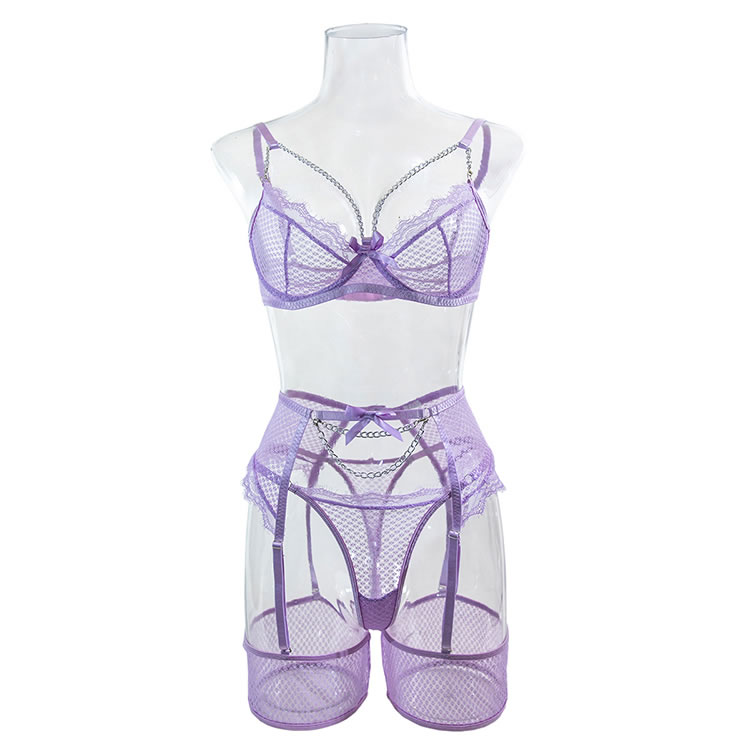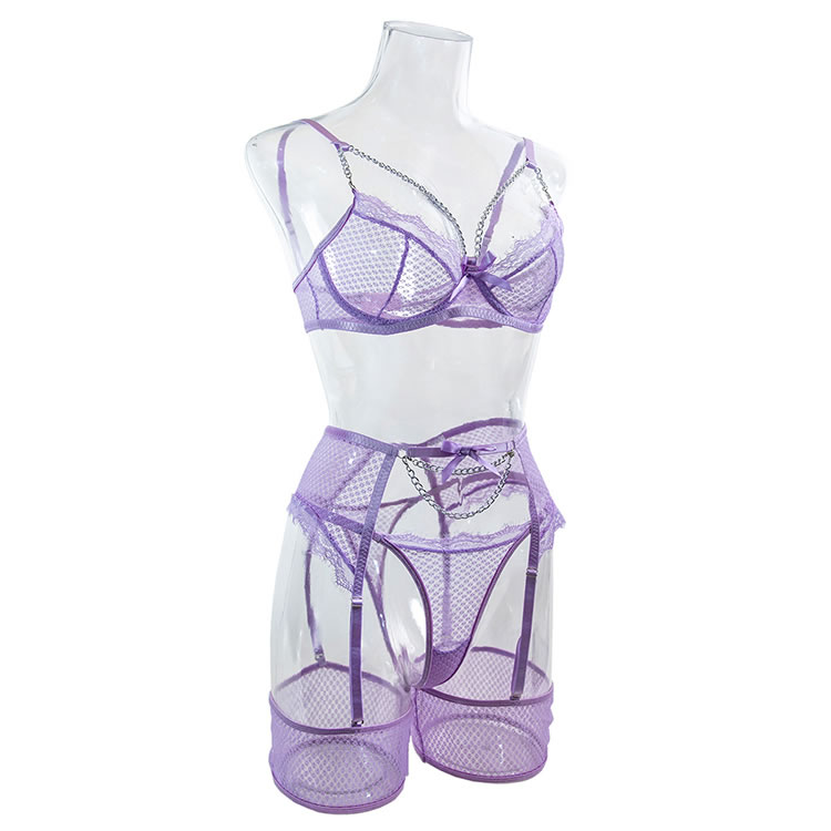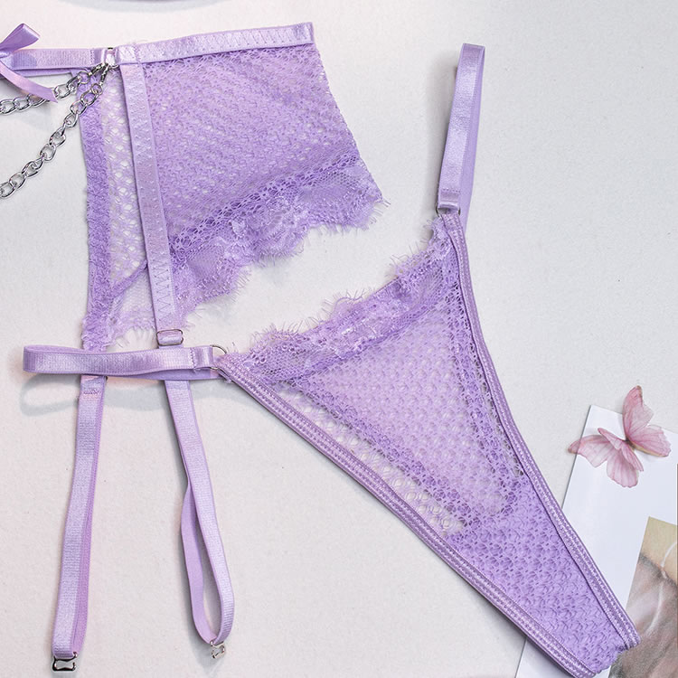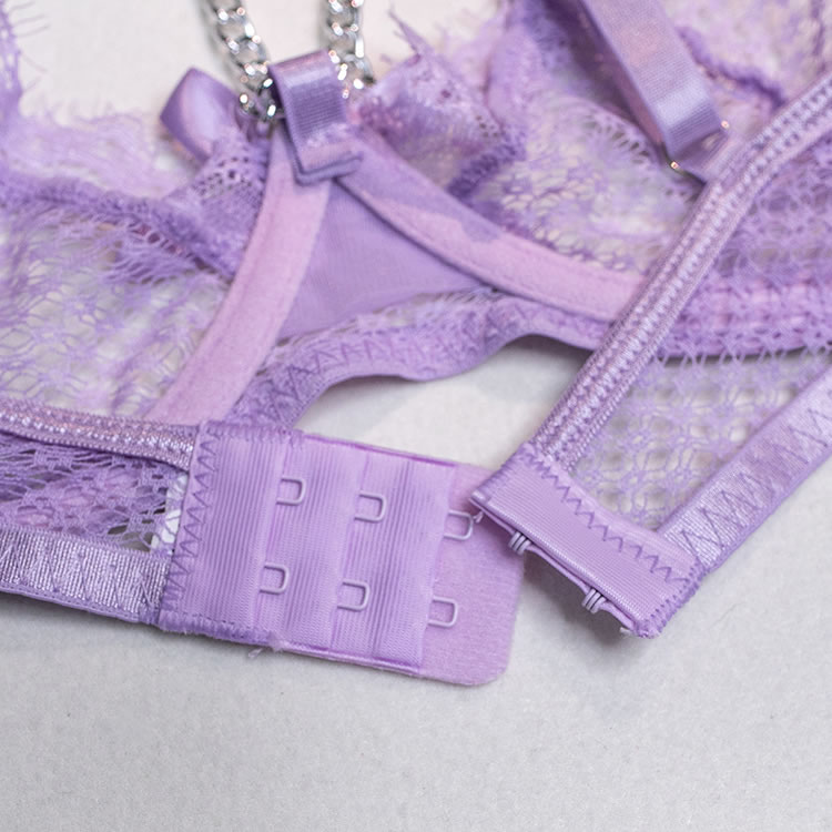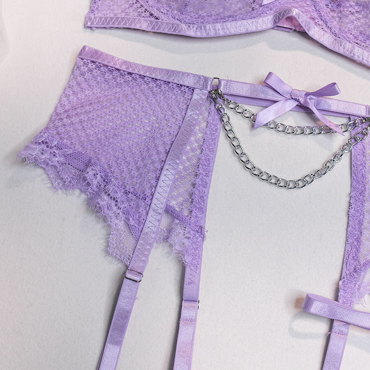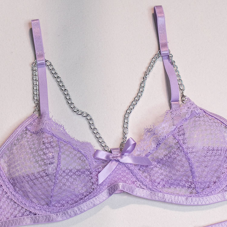 Find yourself irresistible in this exclusive bra set featuring sheer lace underwire cups with a chain detail, adjustable spaghetti straps, a hook and eye back closures, a matching garter belt with adjustable garter straps, wraparound leg garters, and a matching panty with a thong cut back.