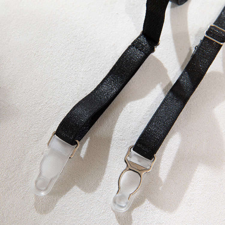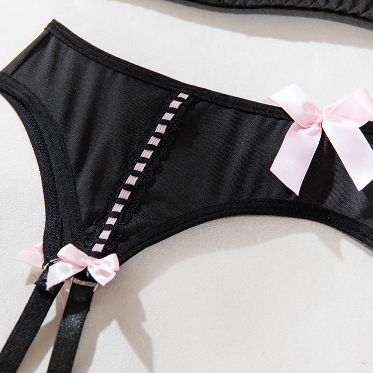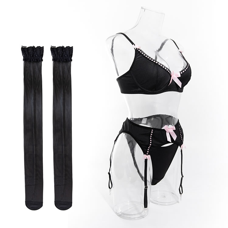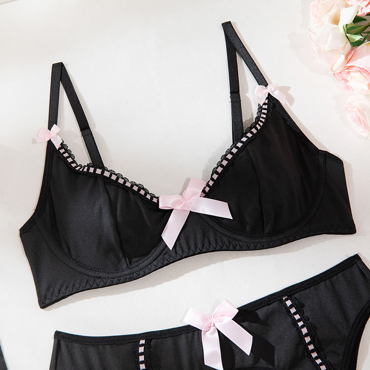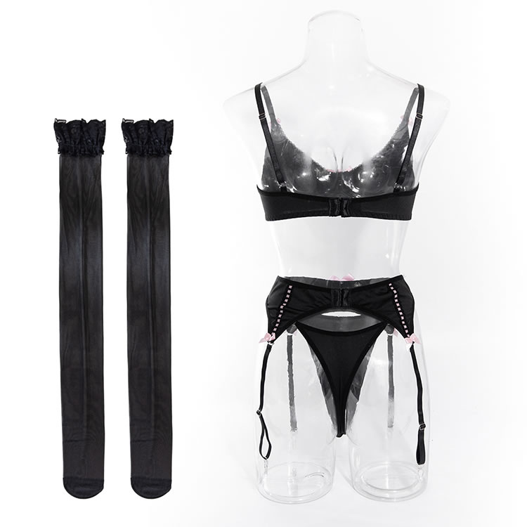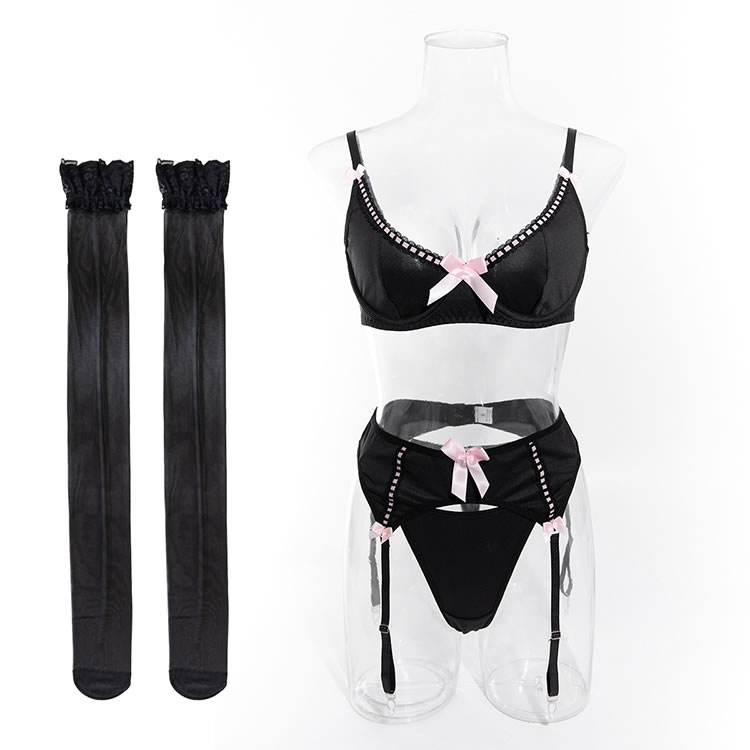 Surprise your lover with this flirty bra set, available in classic black. This alluring 3-piece ensemble features underwire cups for perfect support, adjustable spaghetti straps for a customized fit, and a secure hook and eye back closure. Complete with a seductive garter belt and matching thong panty, this set is designed to enchant and delight.