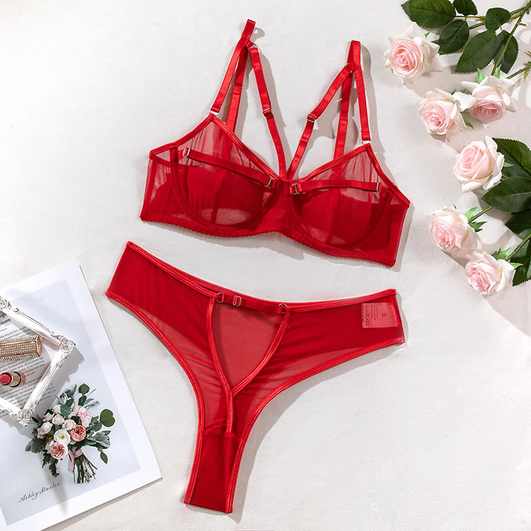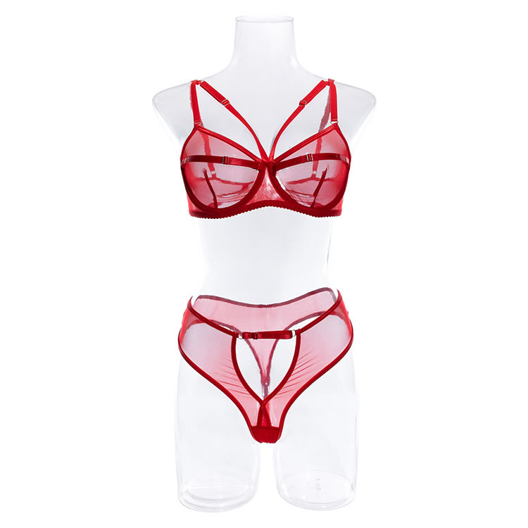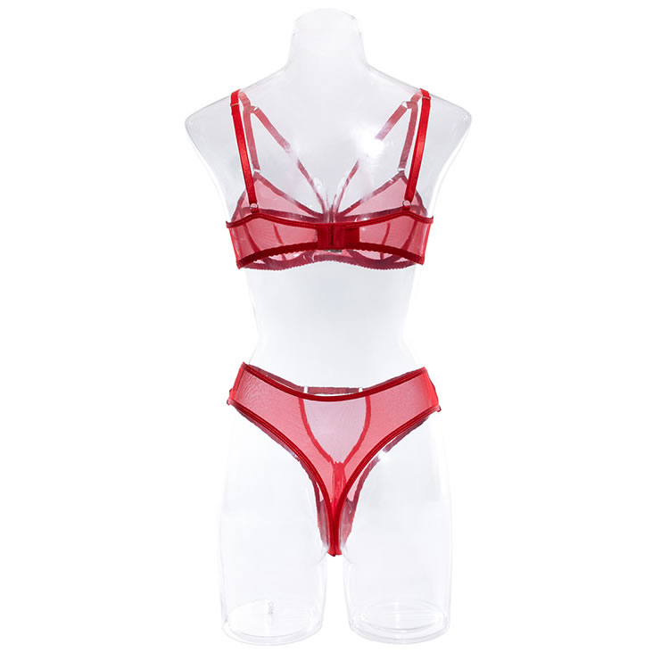 Fulfill midnight dreams in this exclusive bra set featuring sheer mesh cups with strappy detailing, adjustable spaghetti straps, hook and eye back closure, and a matching high waisted panty with keyhole openings, and a thong cut back.