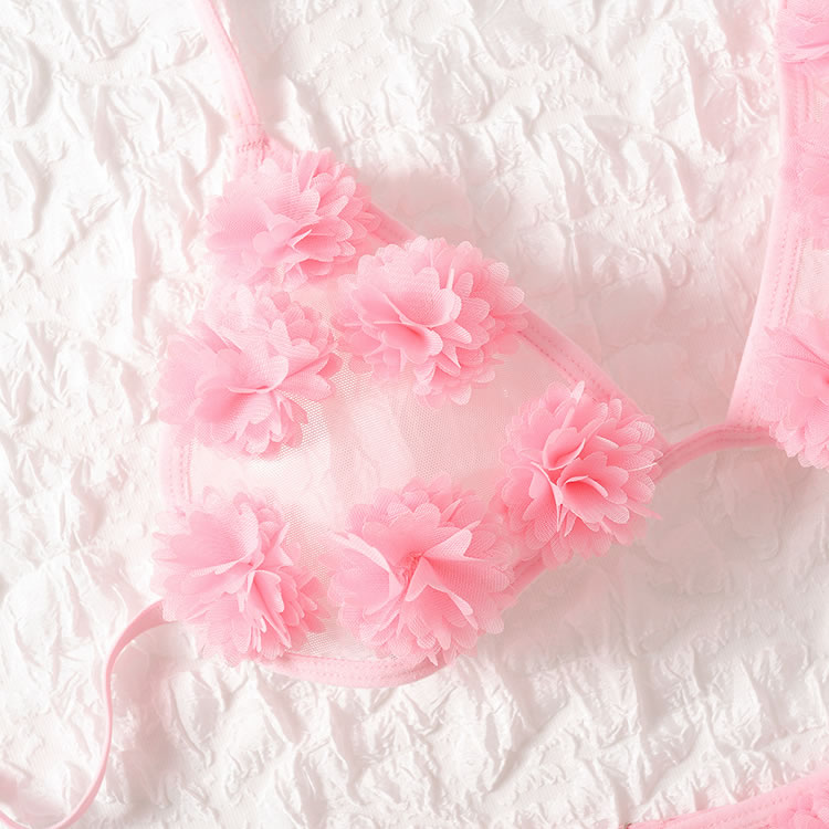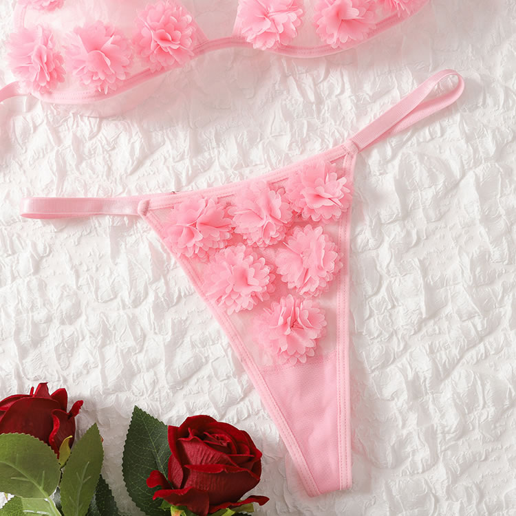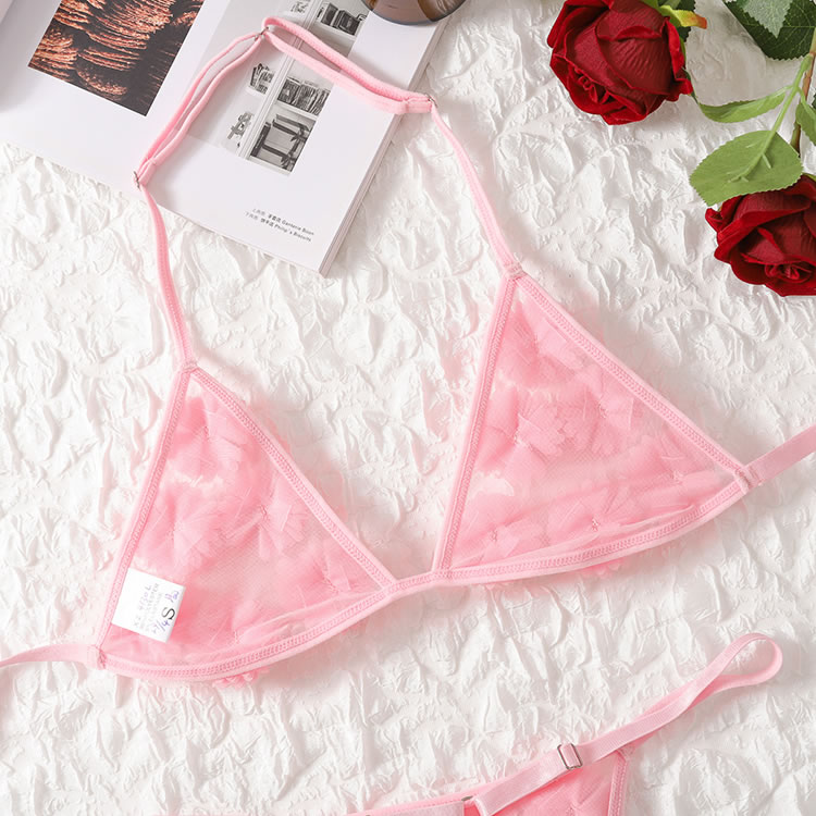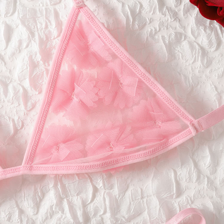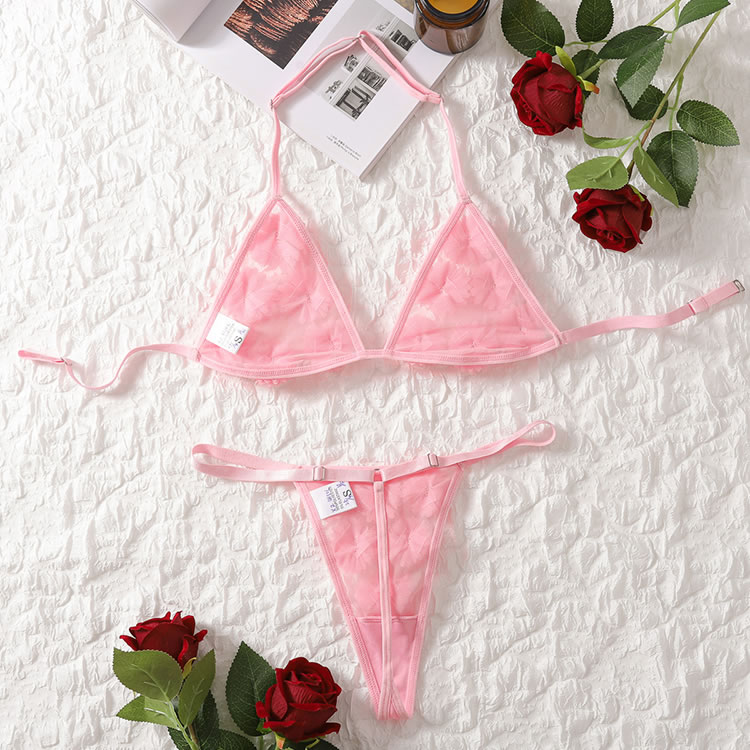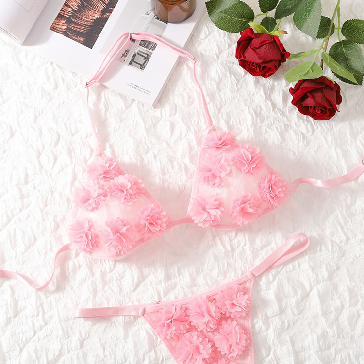 Set the mood with this enticing bra set, featuring sheer mesh triangle cups with floral appliques, flirty halter straps, and a hook-back closure. Paired with a matching thong panty, it's perfect for turning up the heat when the lights go down.