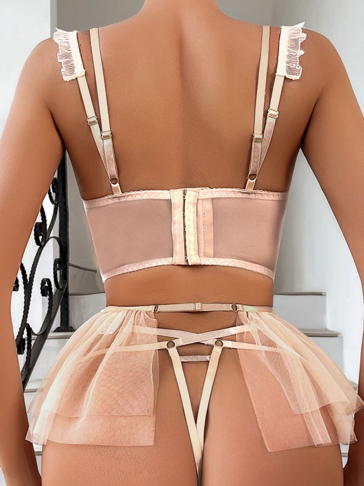 Surprise your lover with this seductive lace bra set, featuring sheer mesh underwire cups adorned with elegant embroidery. Adjustable spaghetti straps and a hook-and-eye back closure ensure a flawless fit. Complete the look with a matching high-waisted garter belt, adjustable garter straps, and a coordinating thong panty.