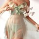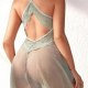 This delicate lingerie set features a soft mint green color with intricate lace detailing throughout the bodice and back. The front showcases a deep V-neckline with bow ties on the straps, adding a playful touch, while the open back reveals a beautiful lace panel that extends into a criss-cross design. A sheer polka-dot tulle overlay drapes elegantly over the body, creating a romantic and airy silhouette. Perfect for those who enjoy a blend of boldness and femininity in their intimate wear.