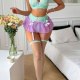 This charming lingerie set brings a soft, dreamy vibe with its pastel color palette and delicate details. The mint green lace bralette features floral embroidery and a sweet bow at the center, offering both support and style. Paired with a flowing lavender petticoat-style skirt that flares gently over the hips, it adds a whimsical touch. The matching garter straps hold fishnet stockings in place, completing the look with a hint of vintage charm. Perfect for those who love a blend of innocence and allure, whether for special occasions or everyday confidence.