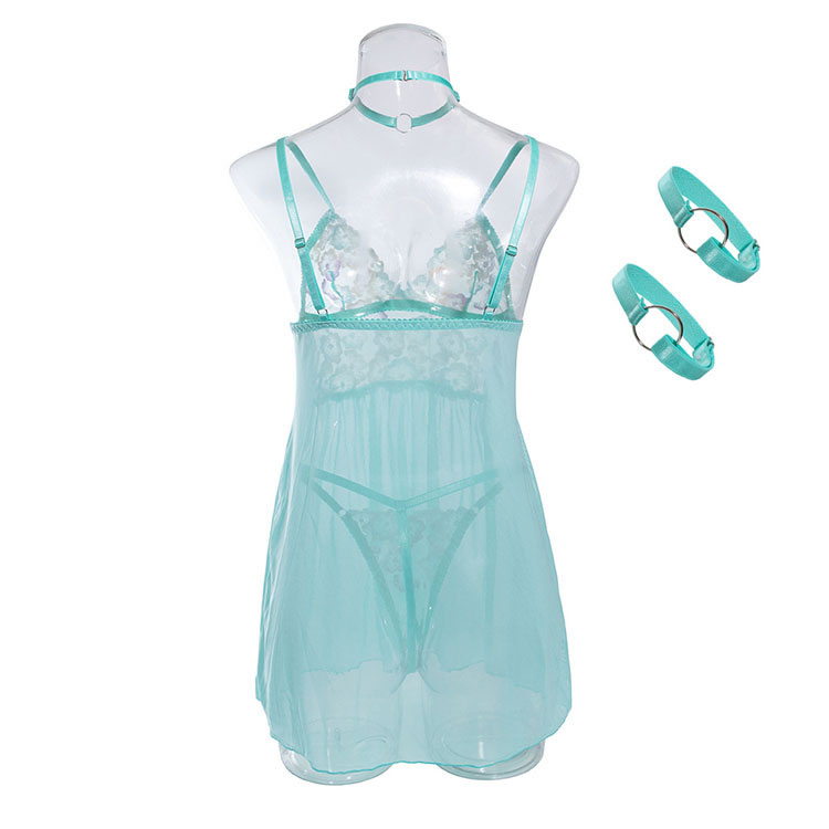Show your babe there's so much more to love in this stunning babydoll set featuring sheer lace cups, adjustable spaghetti straps, a sheer lace and mesh bodice and skirt, choker, wrist cuffs, and a matching thong panty.
