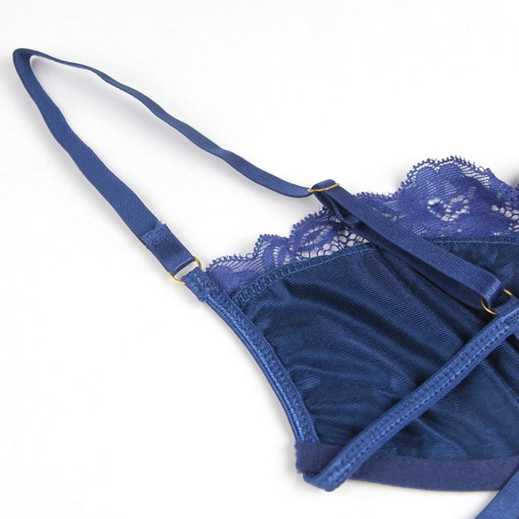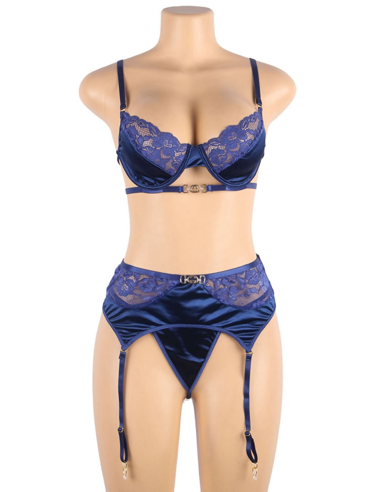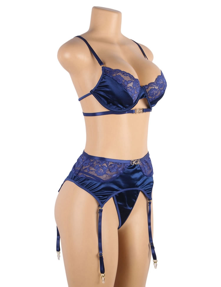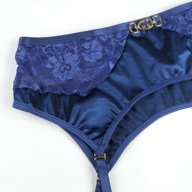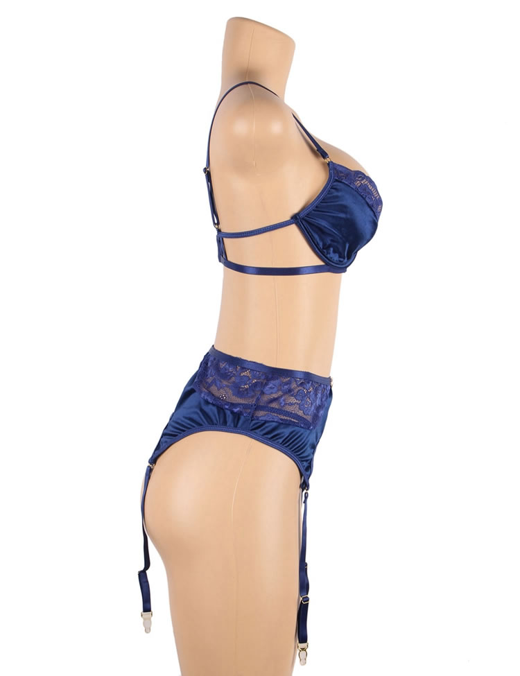 This elegant bra set features soft underwire cups, adjustable spaghetti straps, a hook and eye back closure, a matching garter belt with adjustable garter straps, and a matching panty with a thong cut back.
