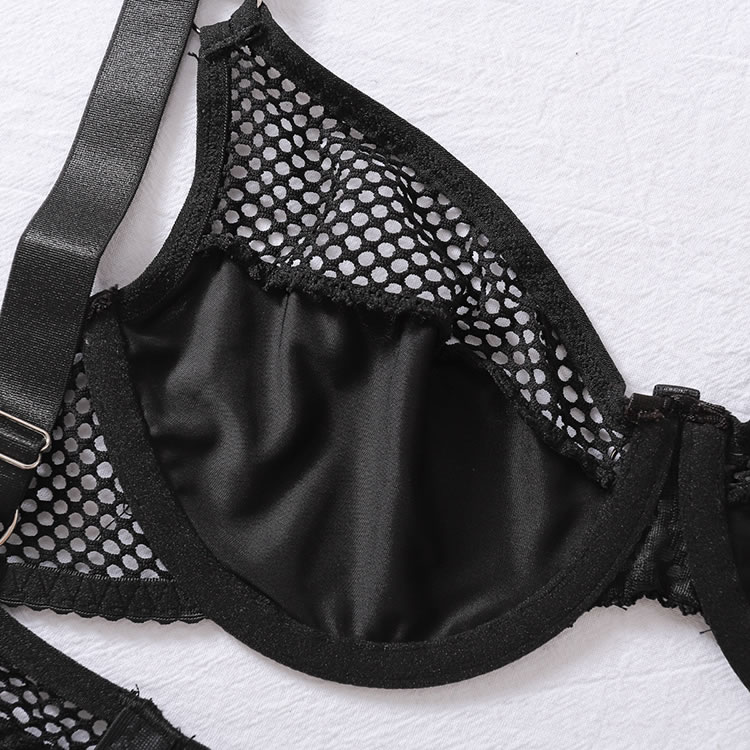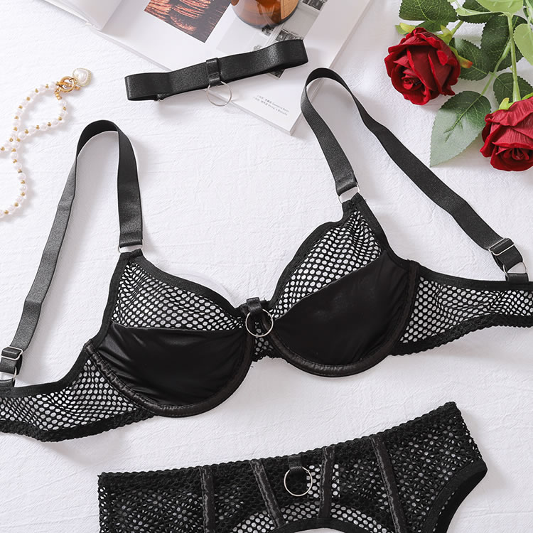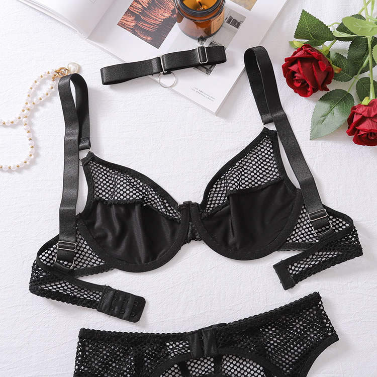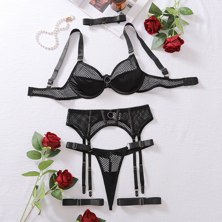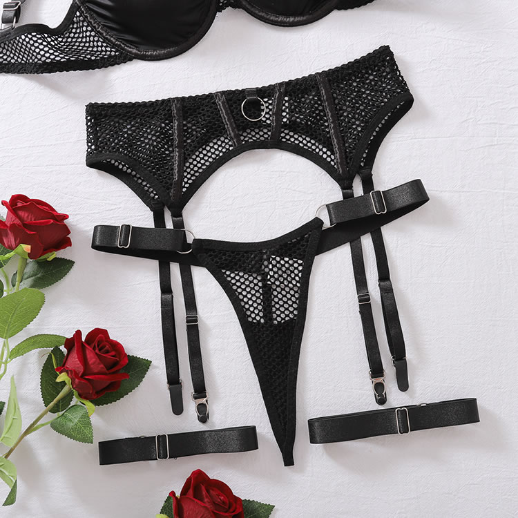 Take charge of your desires in this sexy bra set featuring solid underwire cups with fishnet panels, adjustable spaghetti straps, a hook and eye back closure, a matching garter belt with adjustable garter straps, adjustable wraparound leg garters, and a matching thong.