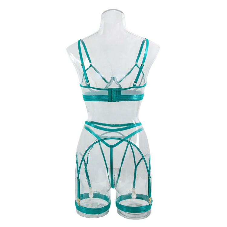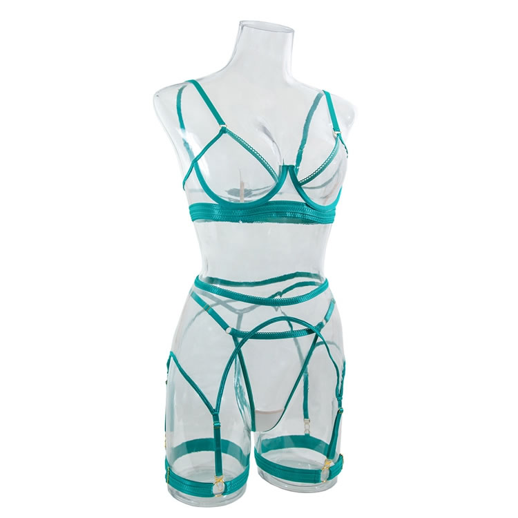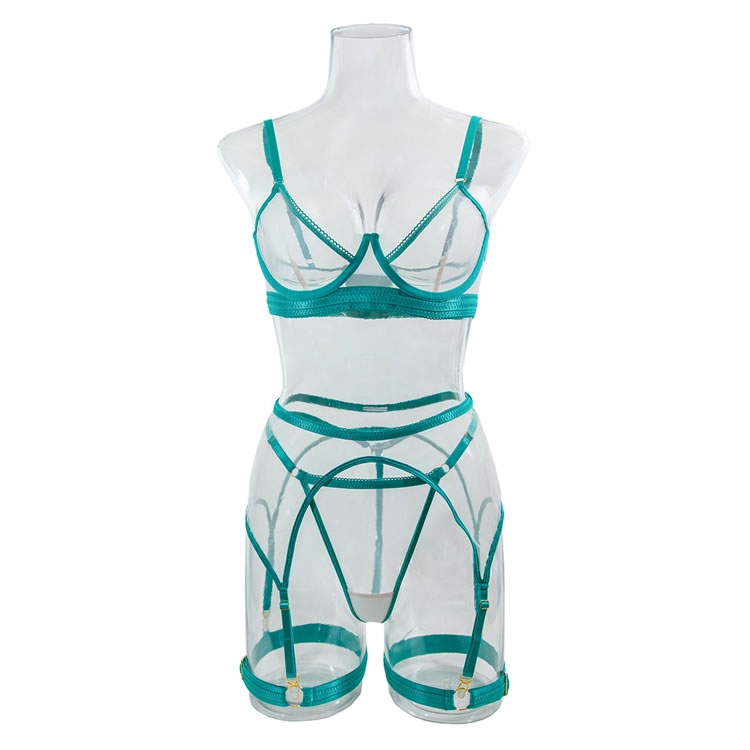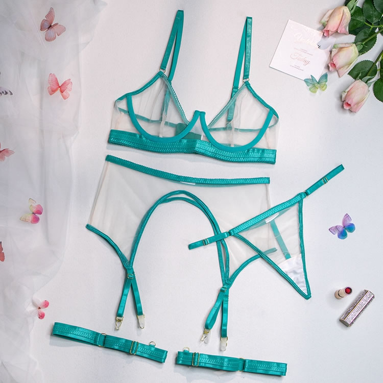 Run the world, babe. Look searing hot in this ultra sexy Exclusive bra set featuring sheer mesh underwire cups, adjustable spaghetti straps, an elastic underbust band with a hook and eye back closure, a matching strappy garter belt with adjustable garter straps, and a matching thong panty.