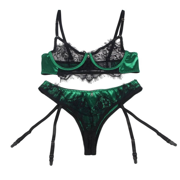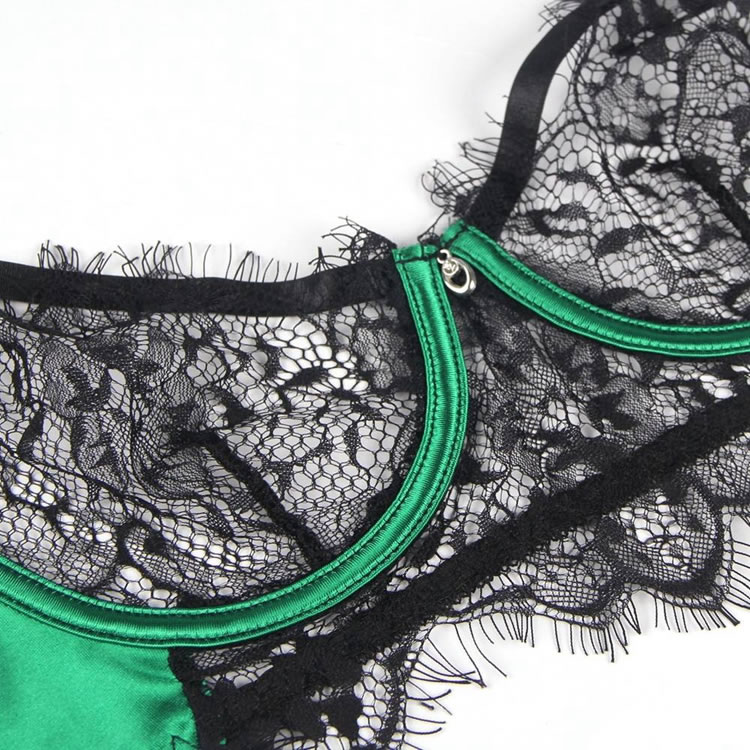 Long for elegance in this stunning bra set featuring sheer eyelash lace underwire cups, adjustable spaghetti straps, a hook and eye back closures, a longline underbust with an eyelash lace trim, and a matching high waisted thong, a black lace overlay, and adjustable garter straps. (Stockings not included.)