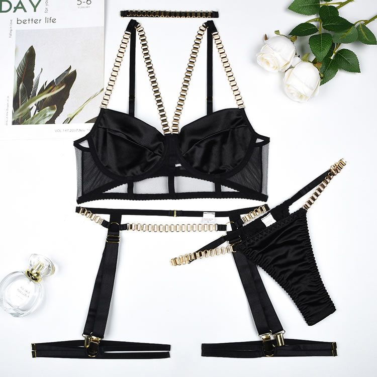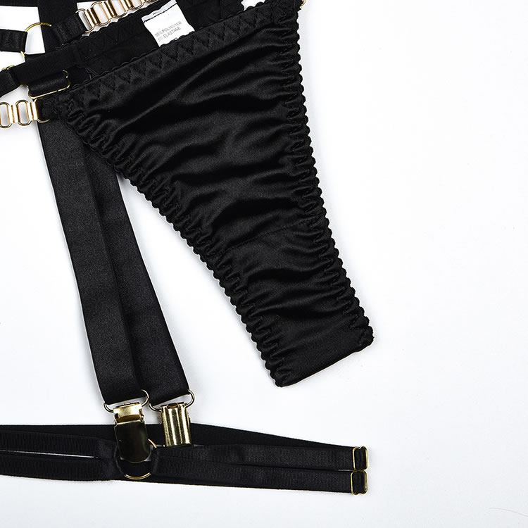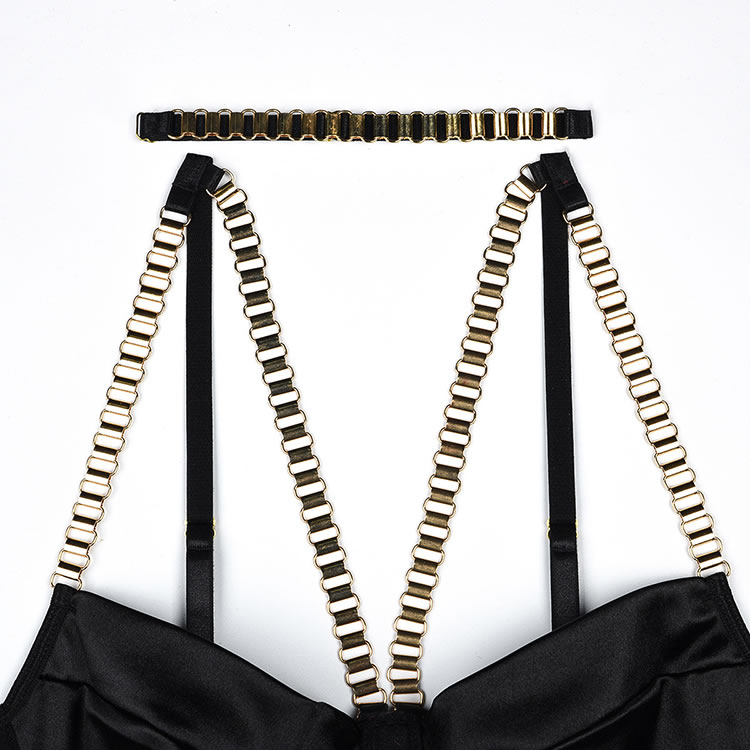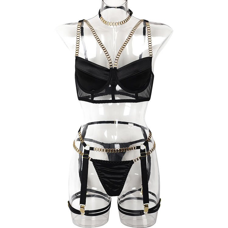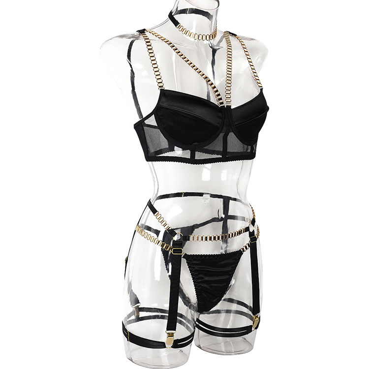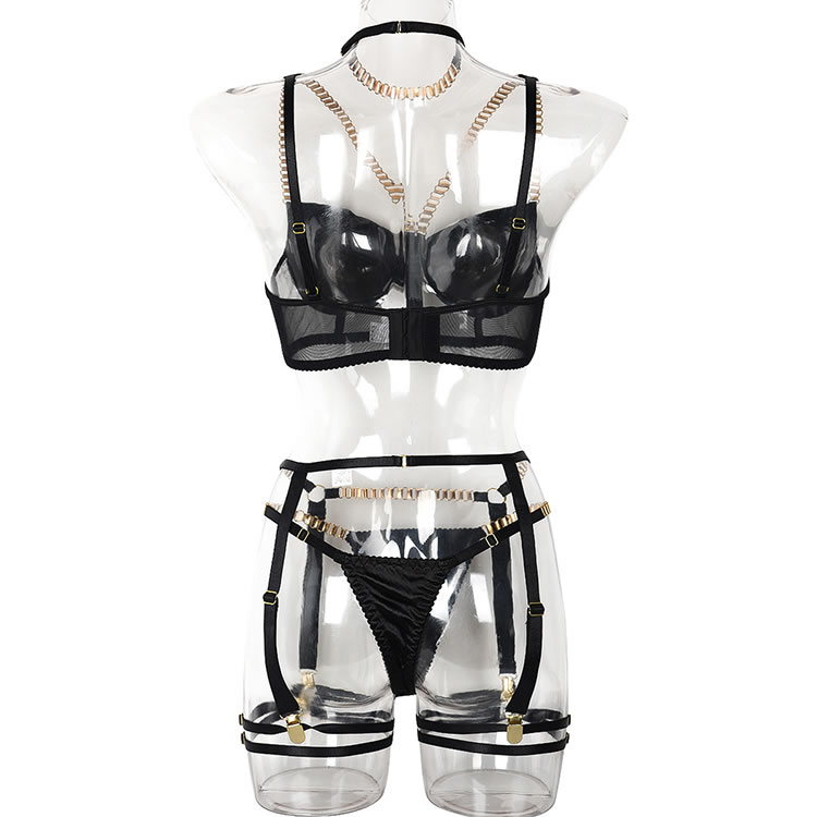Elevate your nightly sessions in this exclusive bra set featuring underwire cups, chain detailing, adjustable spaghetti straps with chain accents, a hook and eye back closure, a matching high waisted garter belt, adjustable garter straps, adjustable wraparound leg garters, choker, and a matching thong.