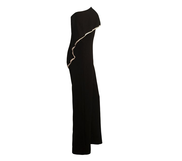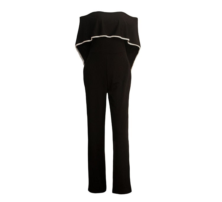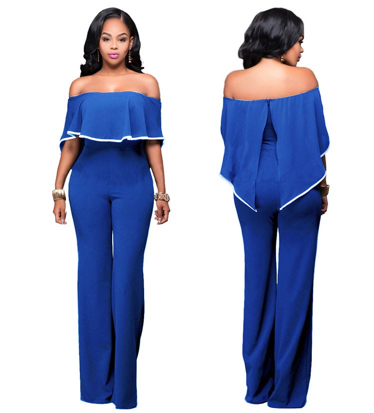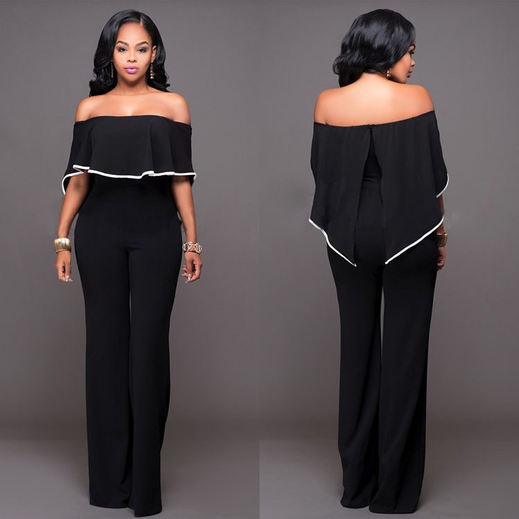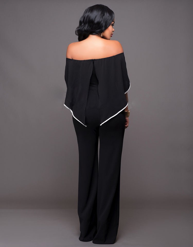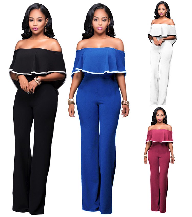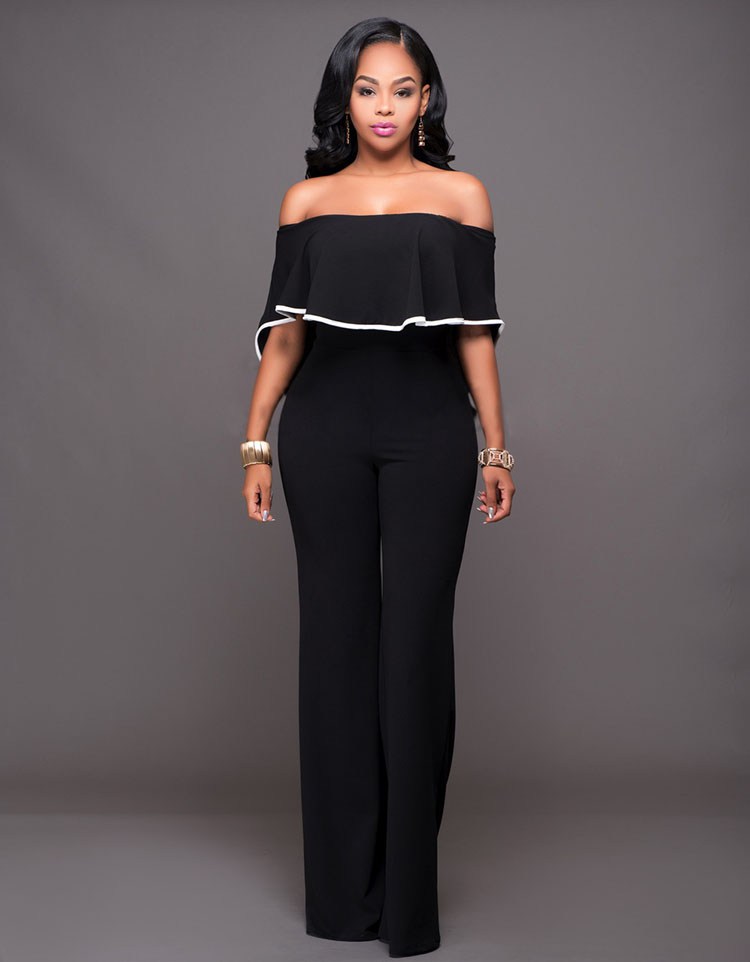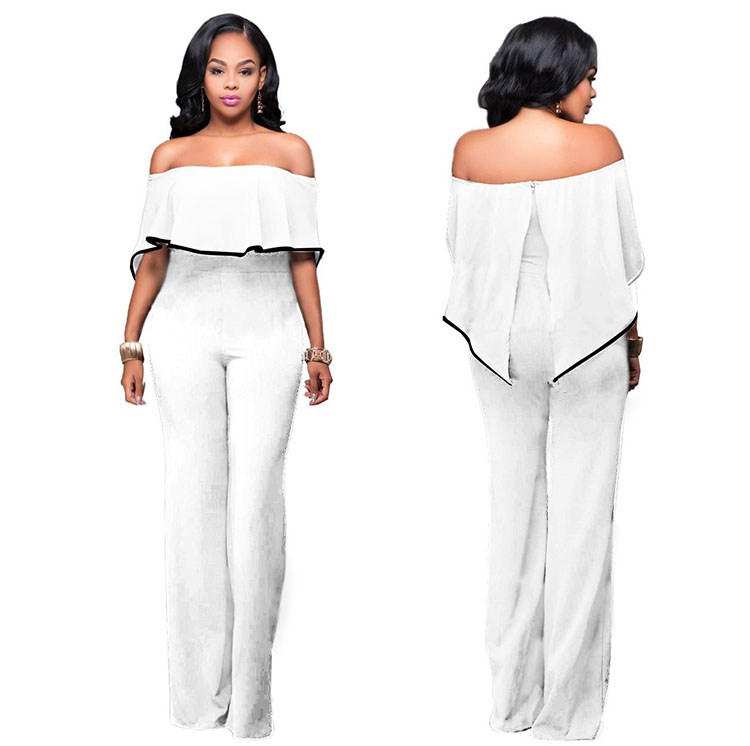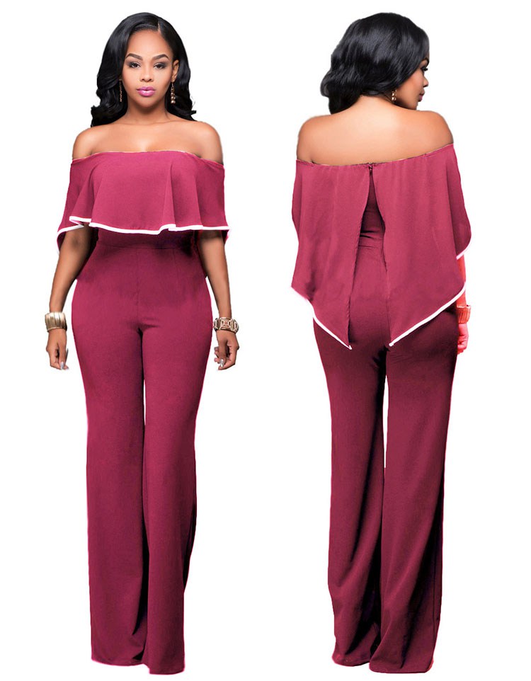 A Jumpsuit featuring an elasticized off-the-shoulder neckline, a flounce layer, short sleeves, and wide legs.