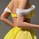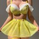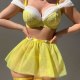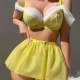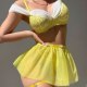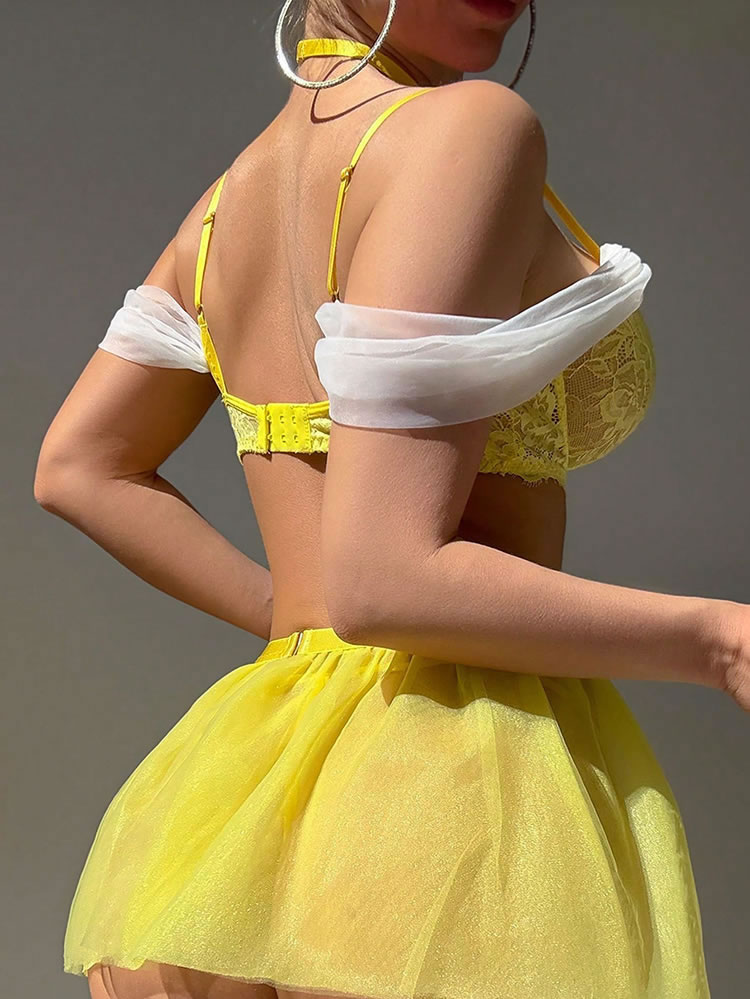 This vibrant yellow lingerie set brings a bold, playful energy with its lace bra featuring off-the-shoulder sheer ruffles and a flirty tulle skirt. The design includes adjustable straps, a matching choker, and garter-style leg bands with delicate chains, creating a cohesive look that’s perfect for making a statement.