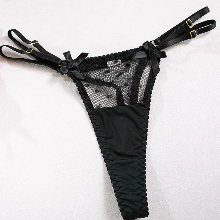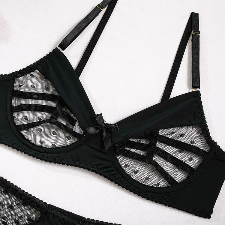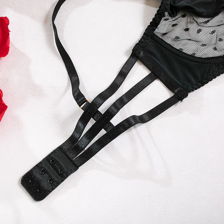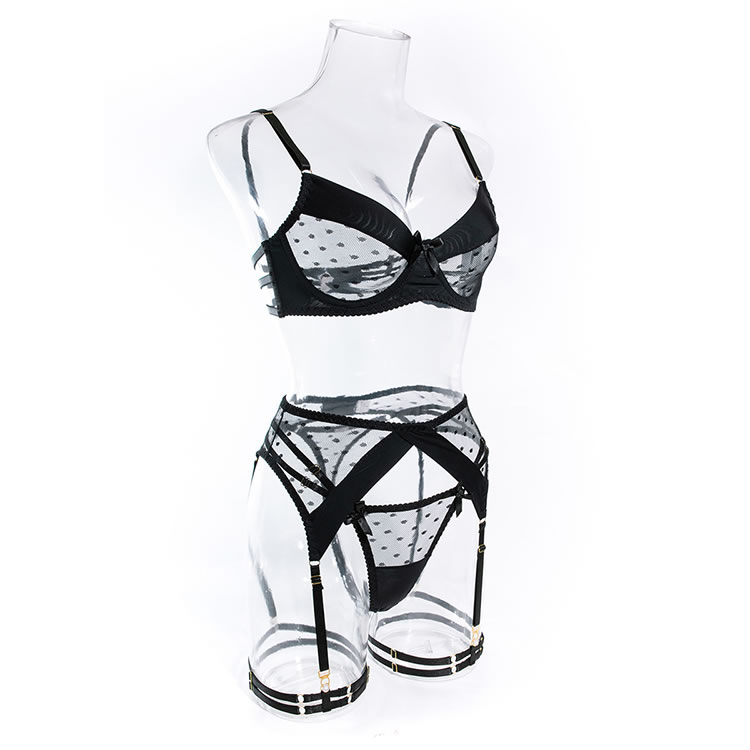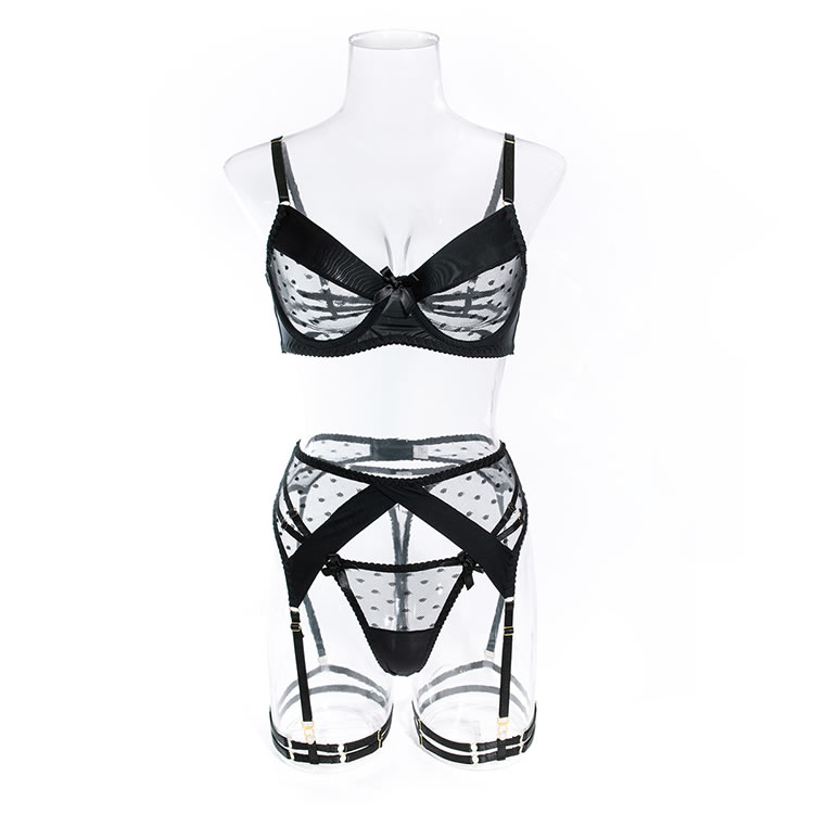 Surprise your sweetie in this sexy four piece lingerie set featuring a sheer mesh underwire cups, a satin bow, adjustable spaghetti straps, a hook and eye back closure, a matching, high waisted garter belt with adjustable garter straps, wraparound leg garters, and a matching thong panty.