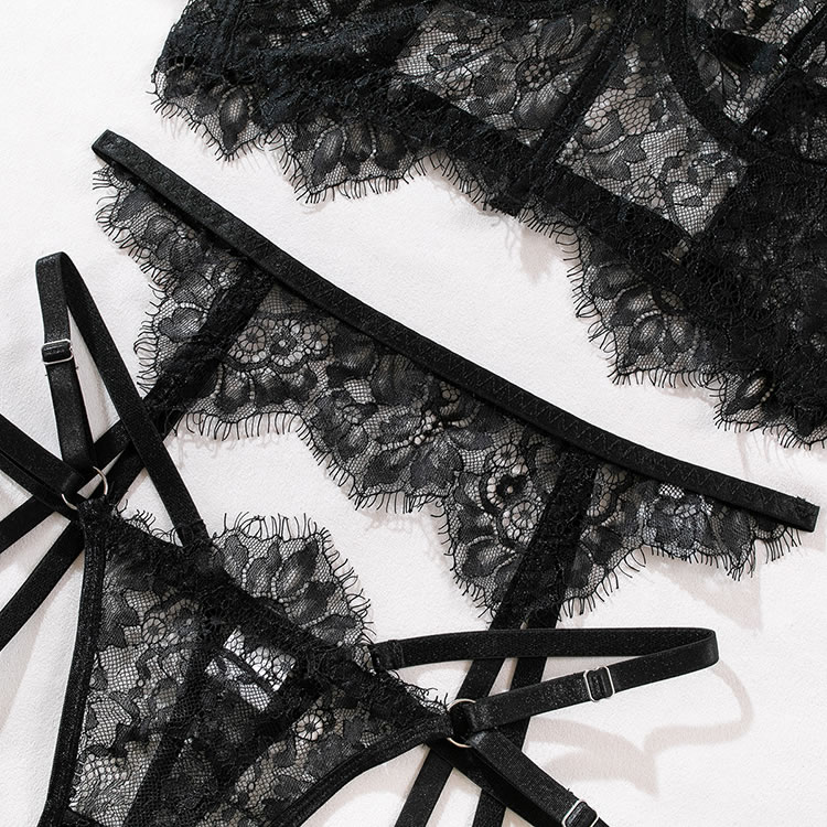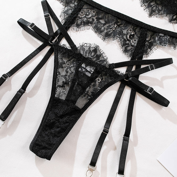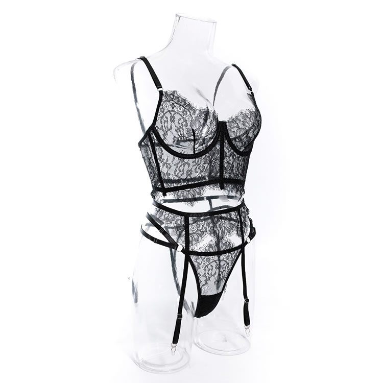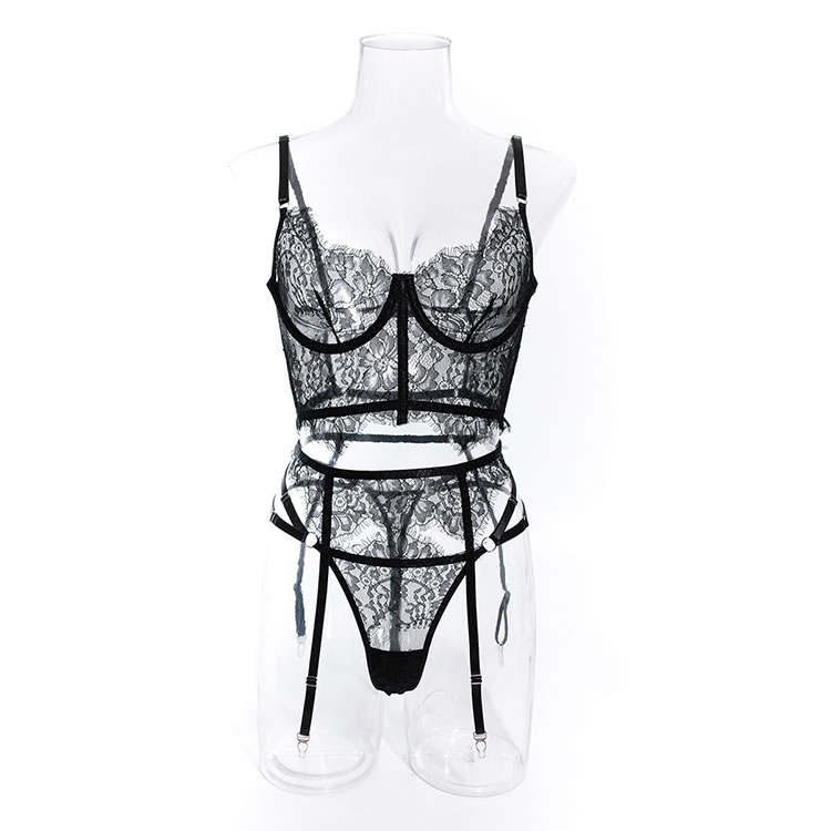 Turn up the heat in this exclusive bra set, available in black and white. This three-piece ensemble features an underwire longline bra with adjustable straps and a hook and eye back closure, complemented by a garter belt with adjustable garter straps and a matching thong panty for an unforgettable evening.