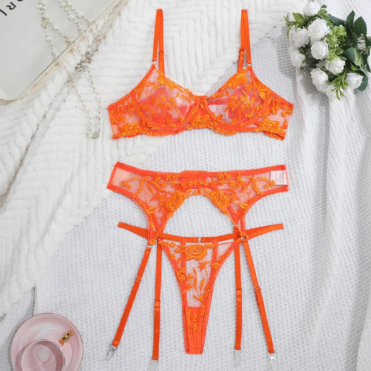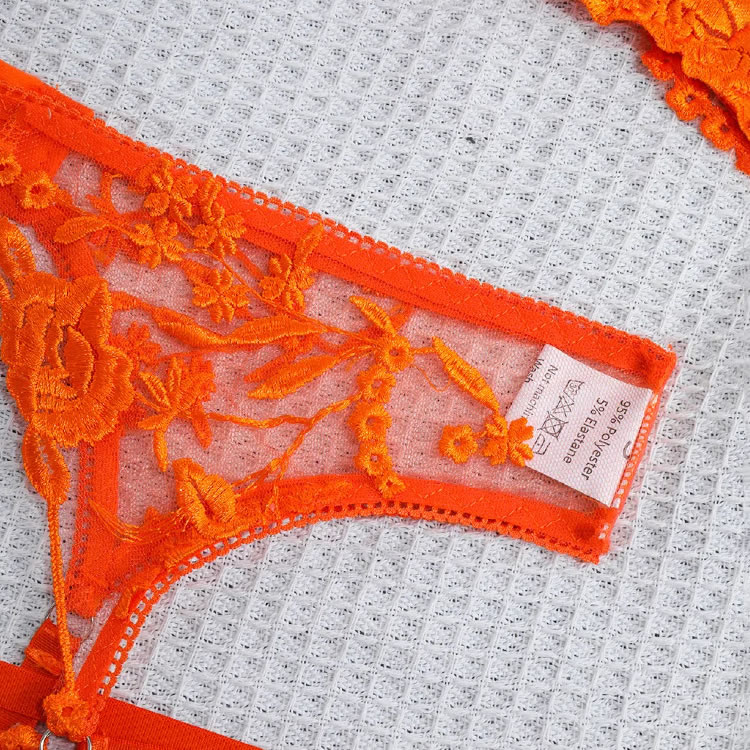 This bold orange lingerie set features a delicate lace design with floral patterns that trace across the bra and matching thong. The bra offers a supportive structure with thin straps and a central clasp closure, while the open back showcases intricate embroidery and a soft mesh base. The high-cut garter belt include an attached garter strap that extends down the thigh, adding a daring touch. Perfect for making a statement, this two-piece combines eye-catching color with elegant detailing.