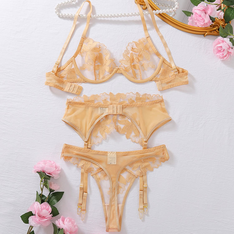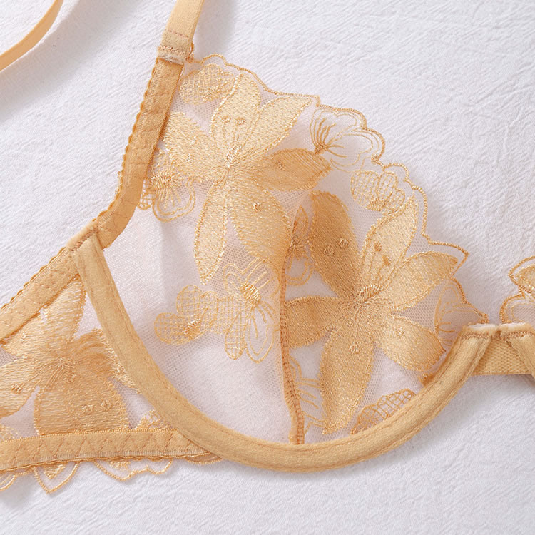 Elevate your evening with this captivating lace bra set. It features sheer lace underwire cups, adjustable spaghetti straps, and a hook-and-eye back closure. The set includes a high-waisted garter belt with adjustable garter straps and a matching thong panty, ensuring you look and feel irresistible.