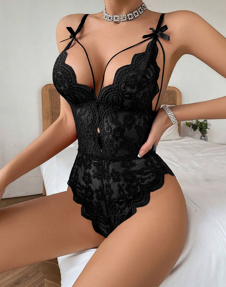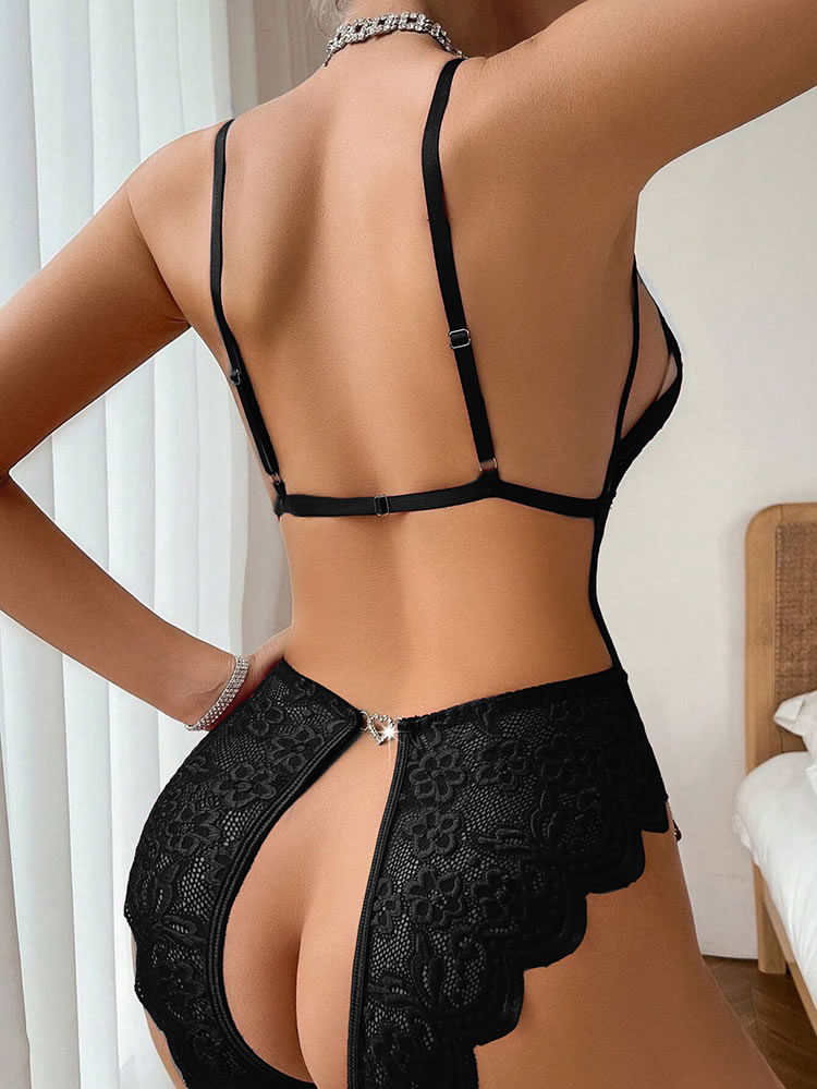 Unleash your allure with this enticing teddy. It features sheer lace triangle cups with strappy detailing, a seductive sheer lace bodice, and adjustable spaghetti straps. The cheeky open back adds a touch of playfulness, making it perfect for a night of irresistible charm and flirtation.