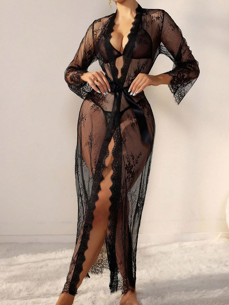 Unwind in style with this elegant lace robe. It features long, flowing sleeves, a sheer bodice adorned with delicate lace trim, and a coordinating waist tie for a flattering fit. Perfect for a touch of sophistication and relaxation, this robe is a timeless addition to your lingerie collection. (Bra not included.)