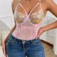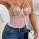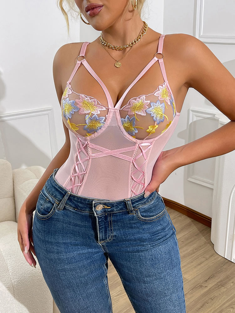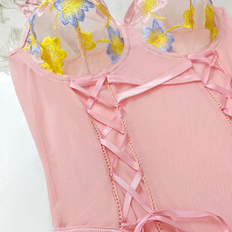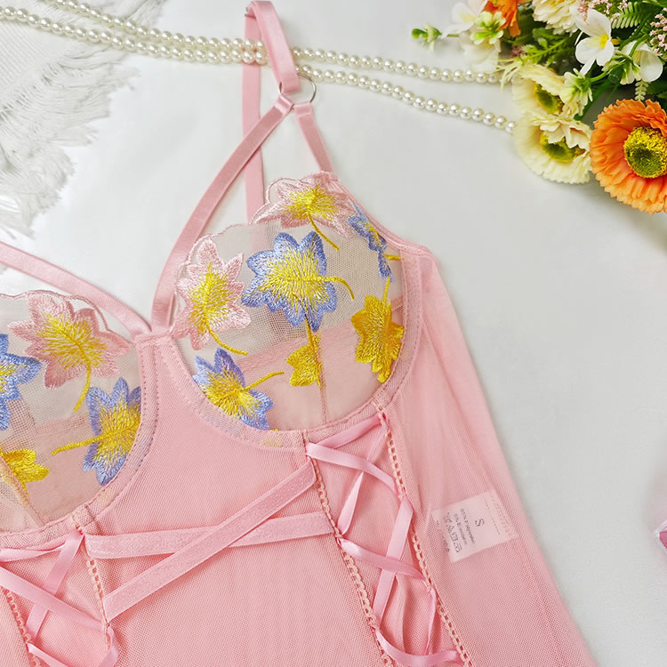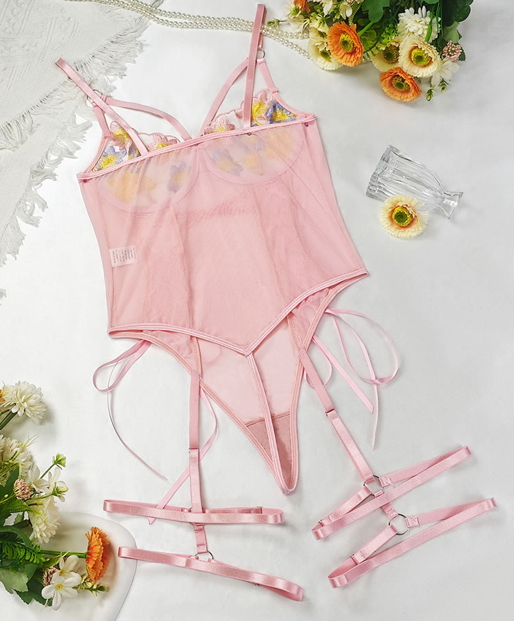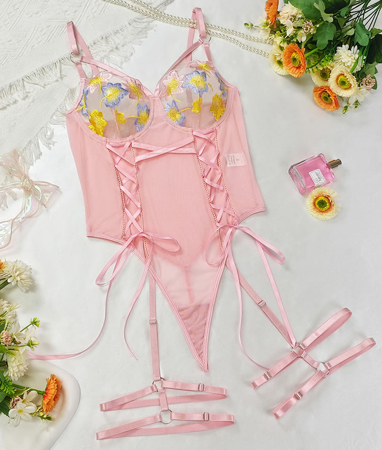 This soft pink bodysuit features a sheer mesh design with floral embroidery on the bust, adding a romantic touch to its bold silhouette. The front includes crisscross lace-up detailing that enhances the waistline, while adjustable garter straps offer support for thigh-high stockings. With thin spaghetti straps and a high-cut leg line, it creates a sleek, feminine look perfect for intimate moments or themed events.