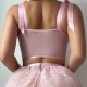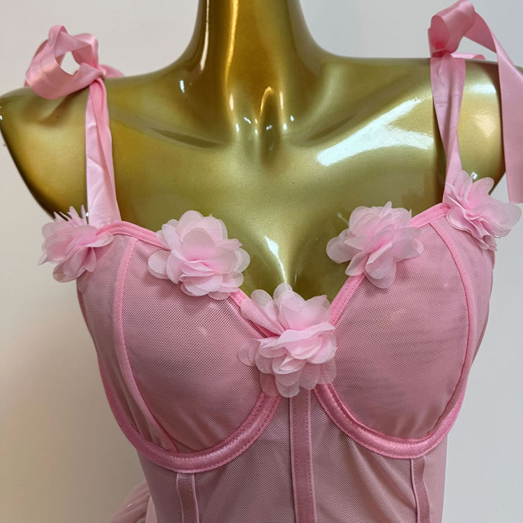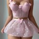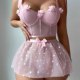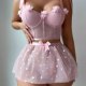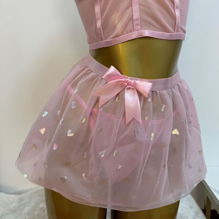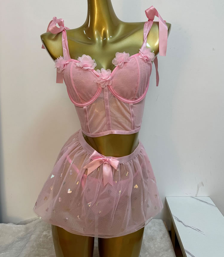 Step into a dreamy world of sweet romance with this adorable lingerie set. Featuring a delicate mesh bustier adorned with soft floral accents and bow-tied straps, it’s designed to flatter and delight. Paired with a sheer tulle skirt sprinkled with shimmering hearts and a matching bow at the waist, this ensemble is perfect for adding a touch of youthful charm to any special moment.
