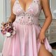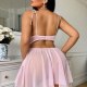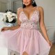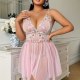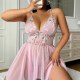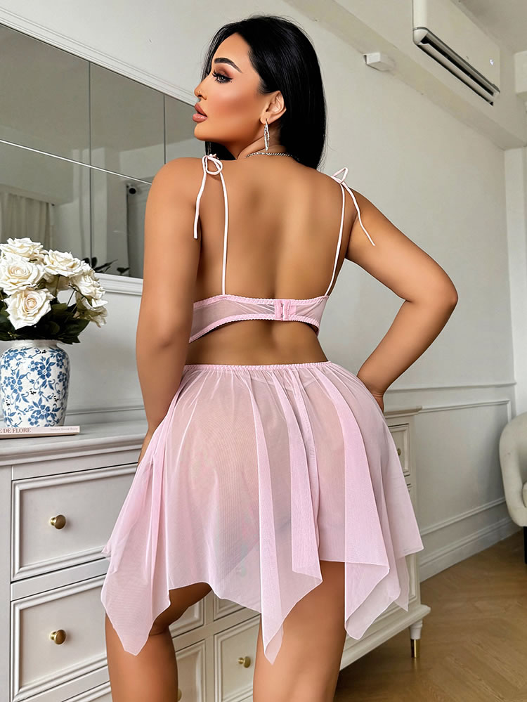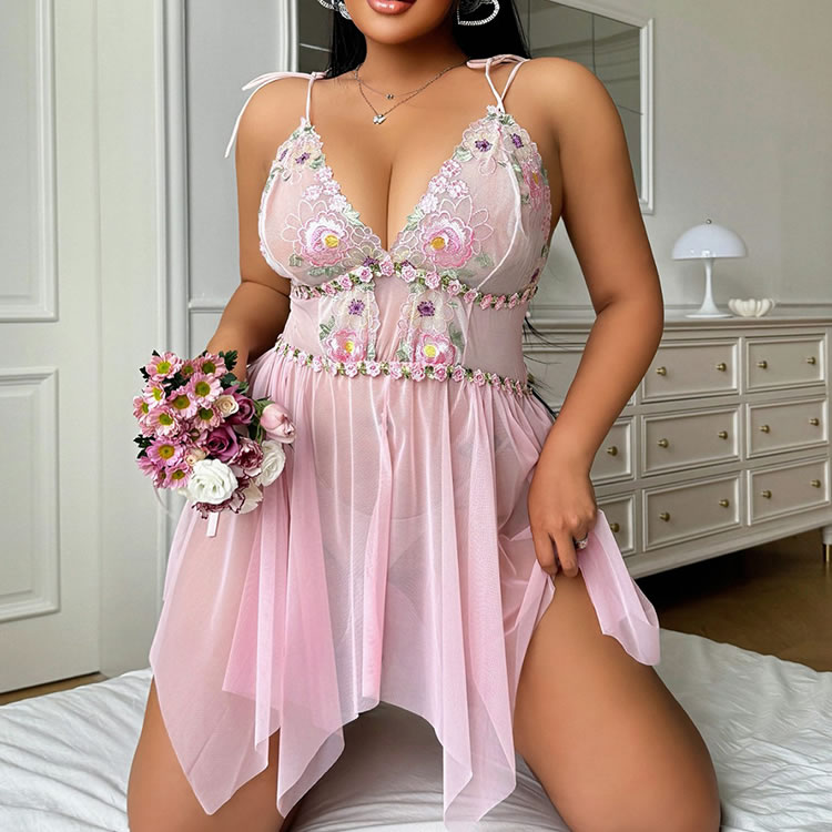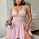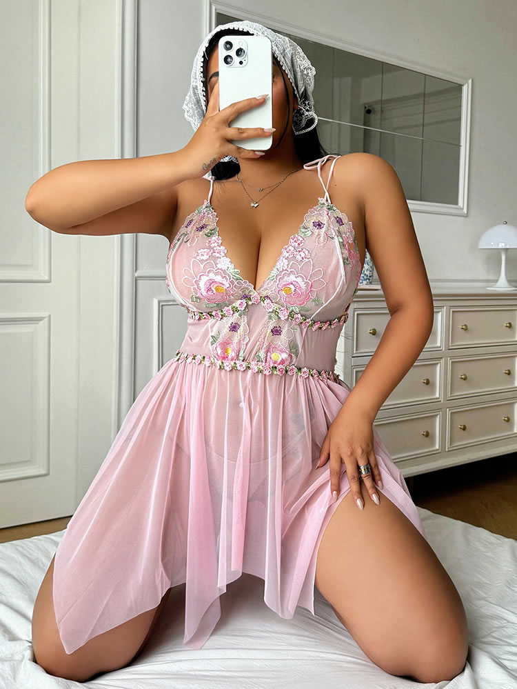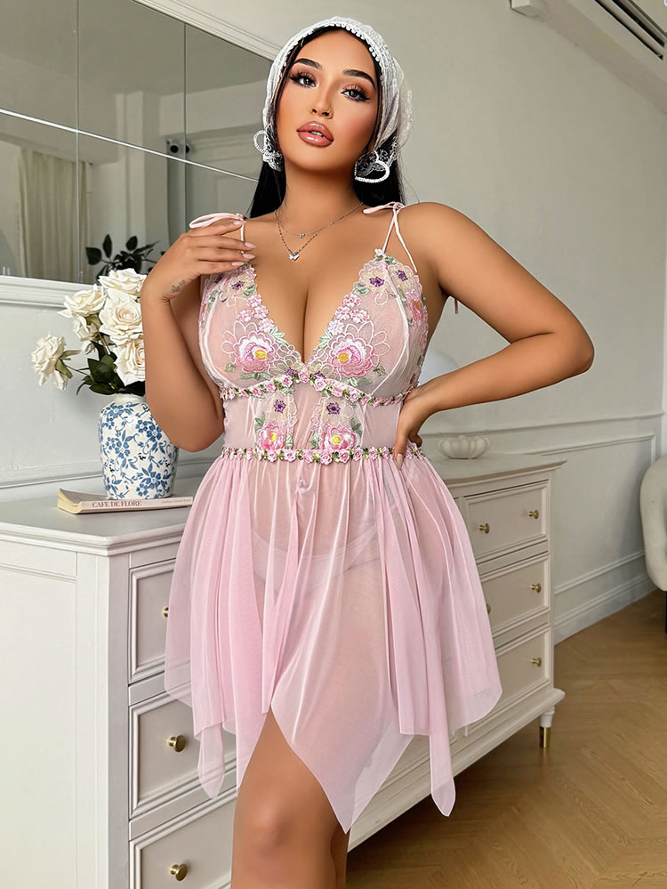Step into softness with this dreamy pink lace nightgown. Delicate floral embroidery adorns the sheer bodice, while adjustable tie straps and a flowing asymmetrical skirt flatter every curve. Lightweight mesh fabric feels gentle against skin — perfect for lazy mornings, romantic evenings, or treating yourself to something sweet.