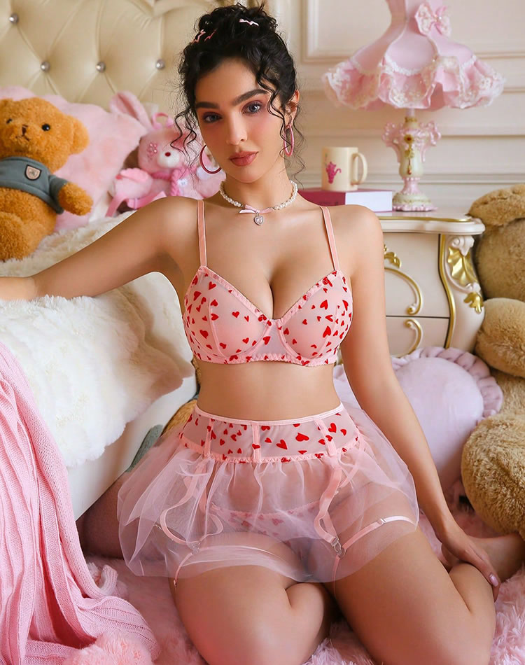Embrace a whimsical charm with this adorable heart-print lingerie set featuring soft pink tones and delicate tulle accents. Designed with a flirty bra and matching garter belt, it’s perfect for adding a touch of romance to your special moments. The playful heart pattern and sweet silhouette make it ideal for date nights, themed outfits, or simply feeling cute and confident at home.