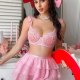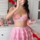 This playful pink lingerie set features a delicate lace bra with scalloped ruffle straps and intricate floral embroidery, offering a sweet yet sensual look. The matching mini skirt is crafted from layered mesh with sparkling polka dots, creating a flirty, tutu-style silhouette that adds movement and charm. Designed for those who love a whimsical and youthful vibe, this two-piece ensemble is perfect for themed nights, romantic occasions, or making a fun fashion statement.