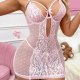 This charming pink bodysuit combines delicate lace details with bold cutouts for a look that’s both sweet and daring. Featuring a sheer mesh base with polka dot accents, it’s adorned with intricate floral lace trim along the bust and hem. The front showcases a deep V-neckline with a small bow accent, while the back reveals a striking crisscross strap design that adds structure and flair. Adjustable suspenders at the hips make it easy to wear with stockings or alone for a bold statement.