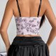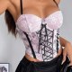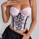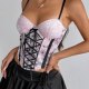 Add a touch of romance to your look with this delicate pink lace corset top. Featuring an intricate black floral pattern over a soft pink base, this strapless-style bustier is supported by adjustable black spaghetti straps for a secure fit. The sweetheart neckline enhances your décolletage, while the front showcases a decorative black criss-cross lacing detail that adds visual interest and a hint of edginess. Vertical black piping defines the structured silhouette, cinching the waist for a flattering shape. Pair it with high-waisted skirts or pants for a stylish and feminine outfit perfect for dates or special occasions.