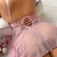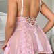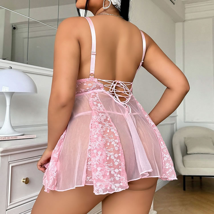 Float through your evening in this dreamy pink lace babydoll. Delicate floral embroidery covers the sheer bodice and flirty skirt, finished with ruffled edges and a crisscross back tie for adjustable shaping. Soft, stretchy mesh feels gentle against skin — perfect for feeling sweet, sensual, and completely yourself.
