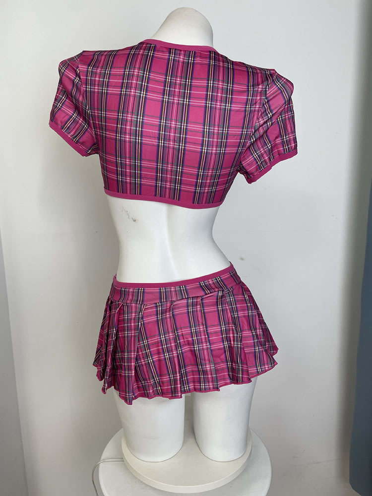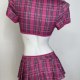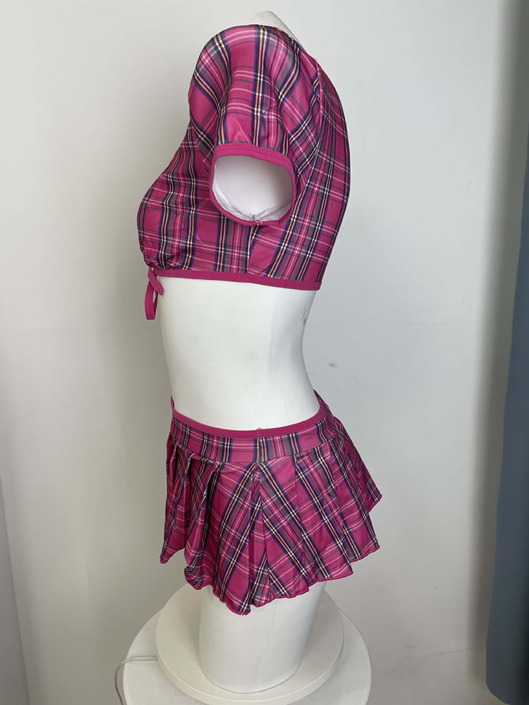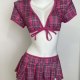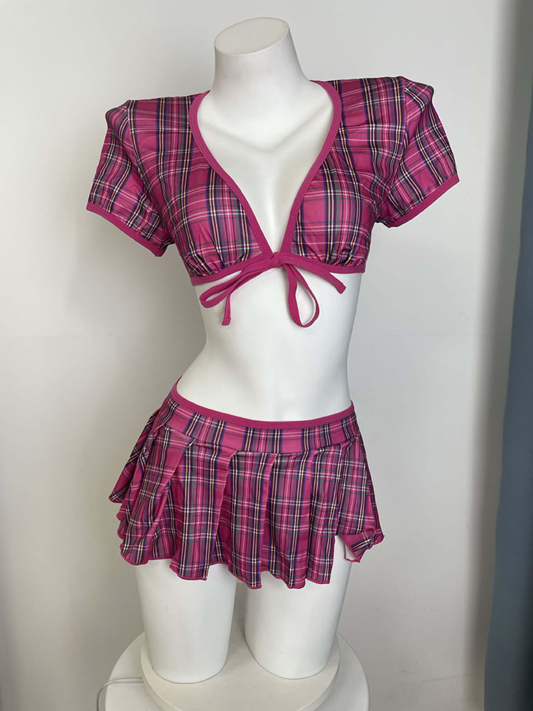 This cheeky two-piece set brings a fun twist to classic schoolgirl vibes. The cropped top features short puffed sleeves and a deep V-neckline tied with a matching fabric bow at the center — adjustable for your preferred level of coverage. Paired with a flirty pleated mini skirt that sits high on the waist, this outfit is perfect for themed parties, cosplay, or adding a bold pop of personality to your wardrobe. Made from soft, stretchy material for comfort and movement.