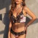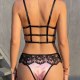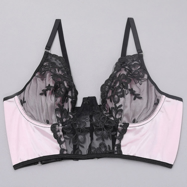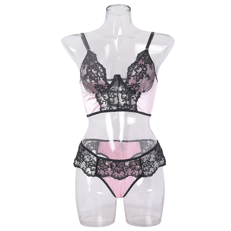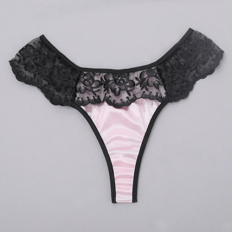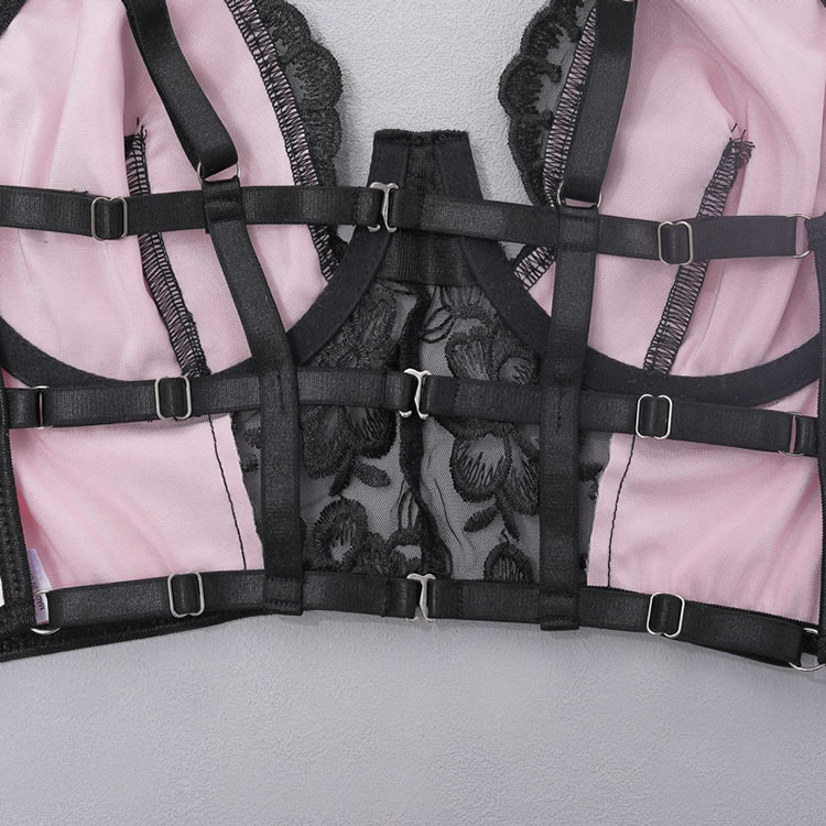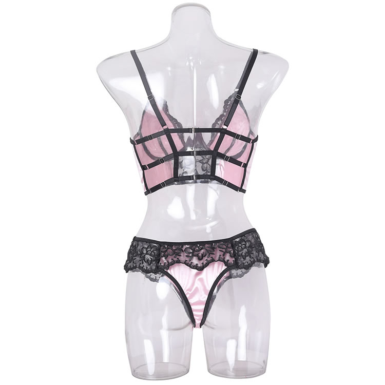 This lingerie set masterfully blends soft romance with modern edge. The bra features a delicate pink satin base, overlaid with intricate black floral lace that creates a striking contrast. The matching thong continues this elegant design, with sheer lace panels and satin details. The true showstopper is the back, which features a complex and alluring harness of multiple black straps, adding a bold, contemporary touch to the otherwise classic and feminine set.
