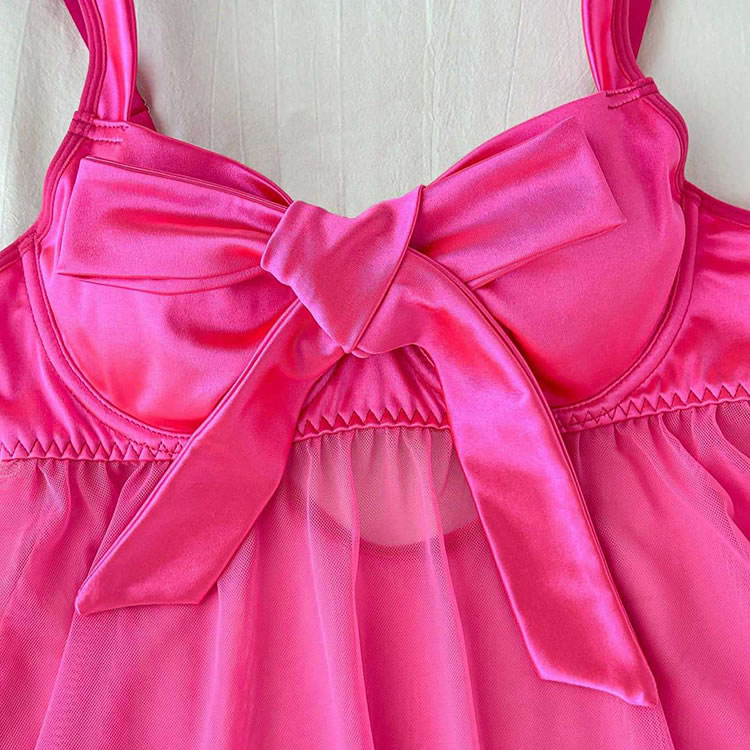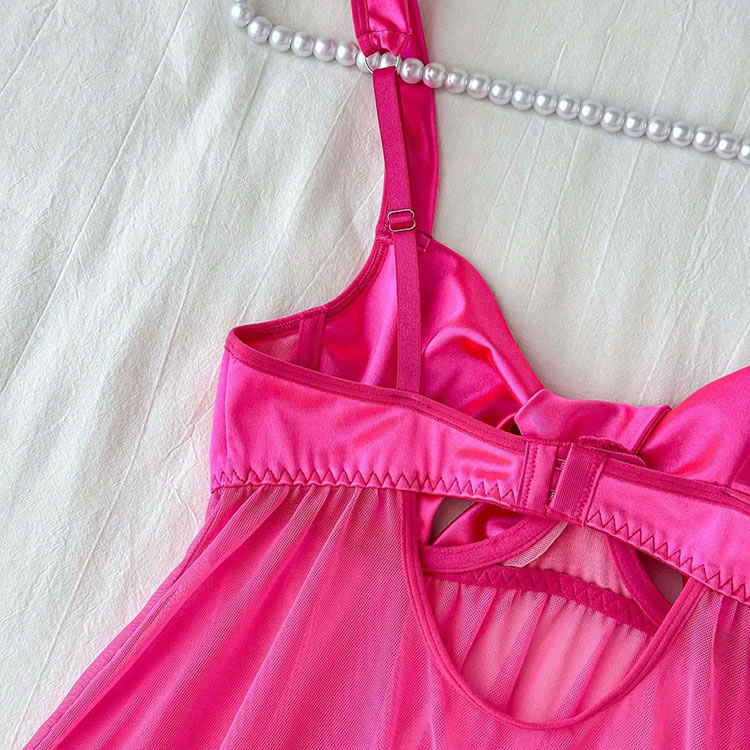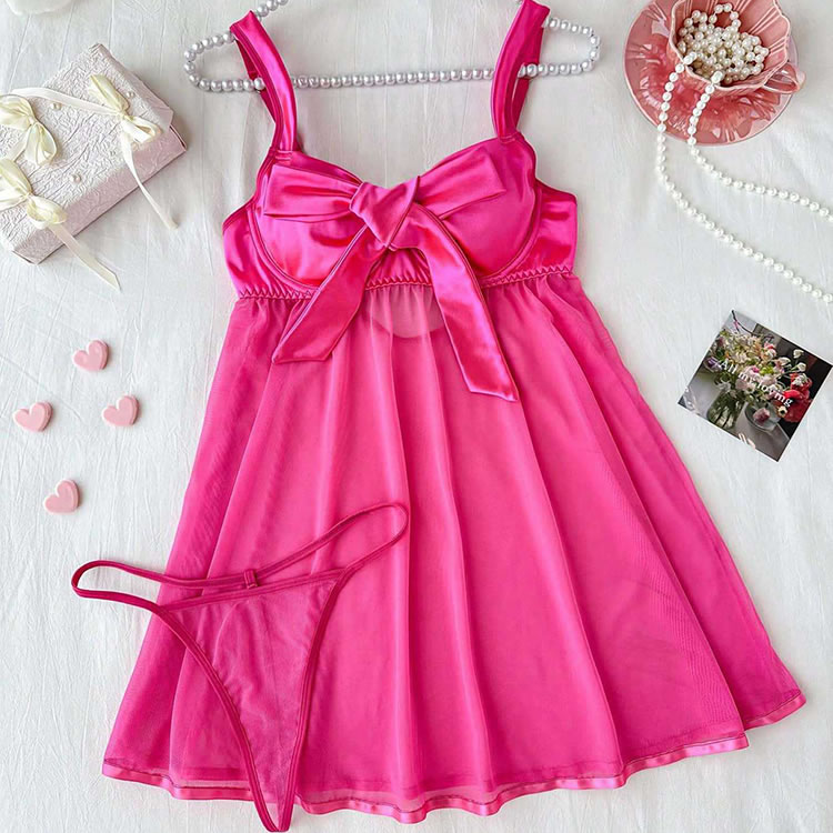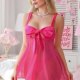 This playful pink nightdress features a flirty silhouette with a bow-tied front detail that adds a sweet and cheeky touch. Crafted from sheer, lightweight fabric, it flows gently around the body, offering a soft drape that enhances movement. The thin adjustable straps and open back design provide both comfort and style, while the short hemline keeps it fun and youthful. Perfect for lounging or making a romantic impression, this dress combines charm with a hint of allure.