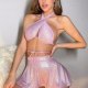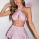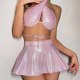 This dazzling pink two-piece set features a shimmering, iridescent fabric that catches the light with every movement. The halter-style top has a crisscross front and open back design, offering a bold silhouette, while the flared mini skirt adds a fun, flirty touch. Perfect for themed parties, costume events, or making a statement at a night out, this outfit combines sparkle and confidence in one striking look.