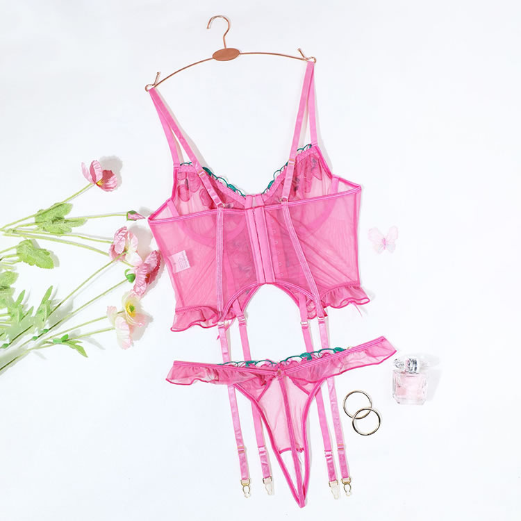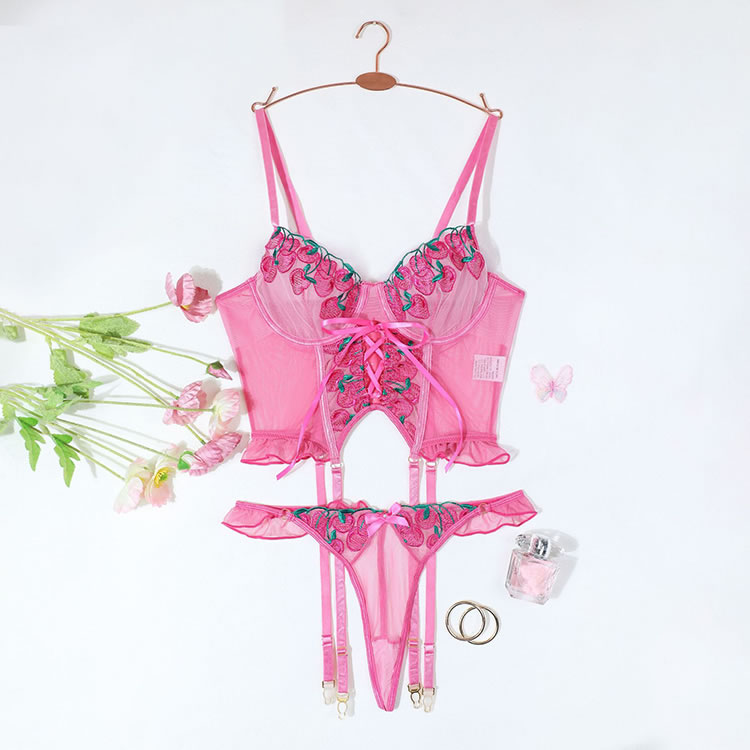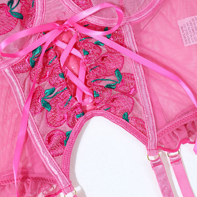 Embrace bold charm with this vibrant pink lingerie set featuring playful strawberry embroidery and delicate ruffles. Designed with a corset-style top that includes adjustable lace-up detailing and thin shoulder straps, it offers both structure and style. The matching thong, all-in-one look perfect for making a statement. Ideal for those who love fun, feminine patterns and a touch of vintage flair.