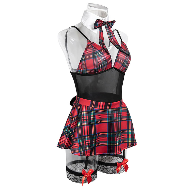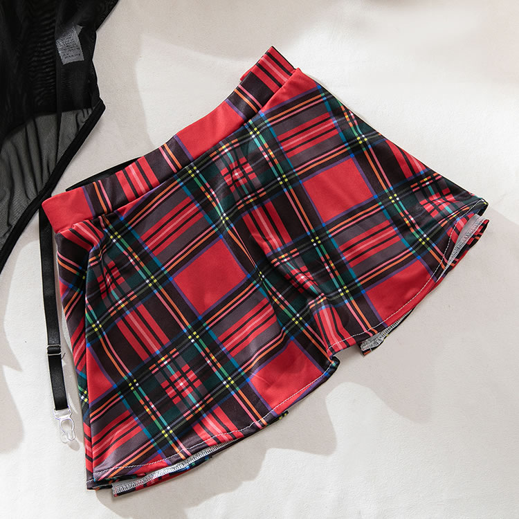 Designed for confidence and fun, this retro-inspired lingerie set combines a flirty plaid print with modern sensuality. The structured bralette and high-waisted skirt create a flattering silhouette, while the sheer mesh panel at the front adds a hint of mystery. Paired with garters and a matching necktie, it’s ideal for themed nights or adding a playful twist to intimate moments.