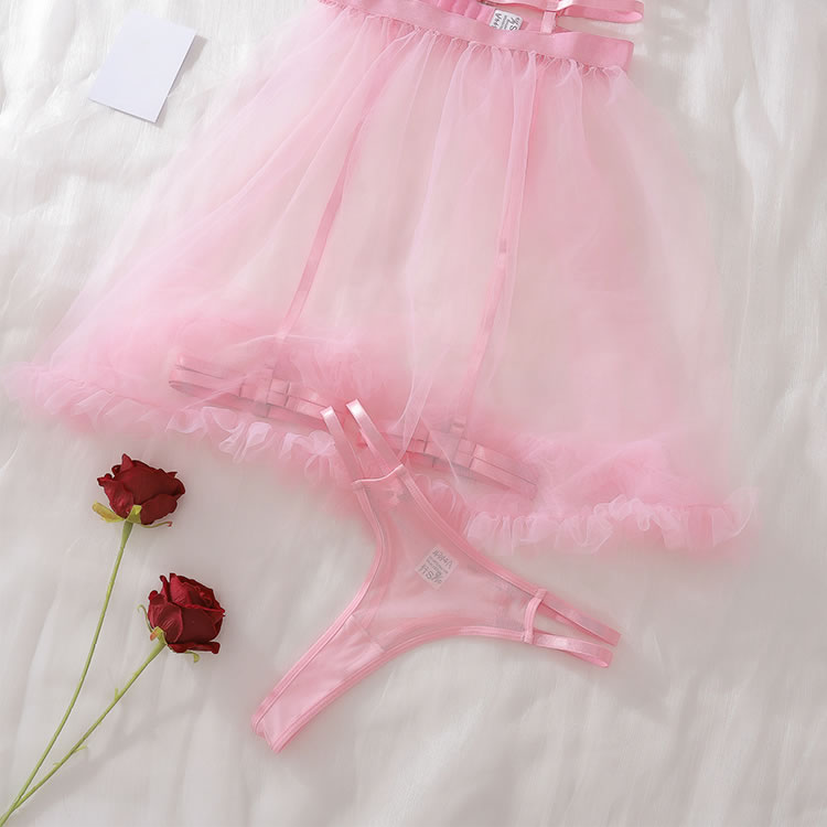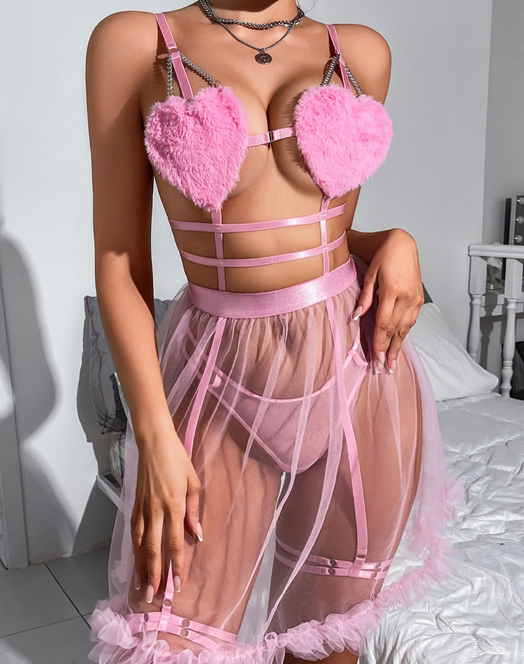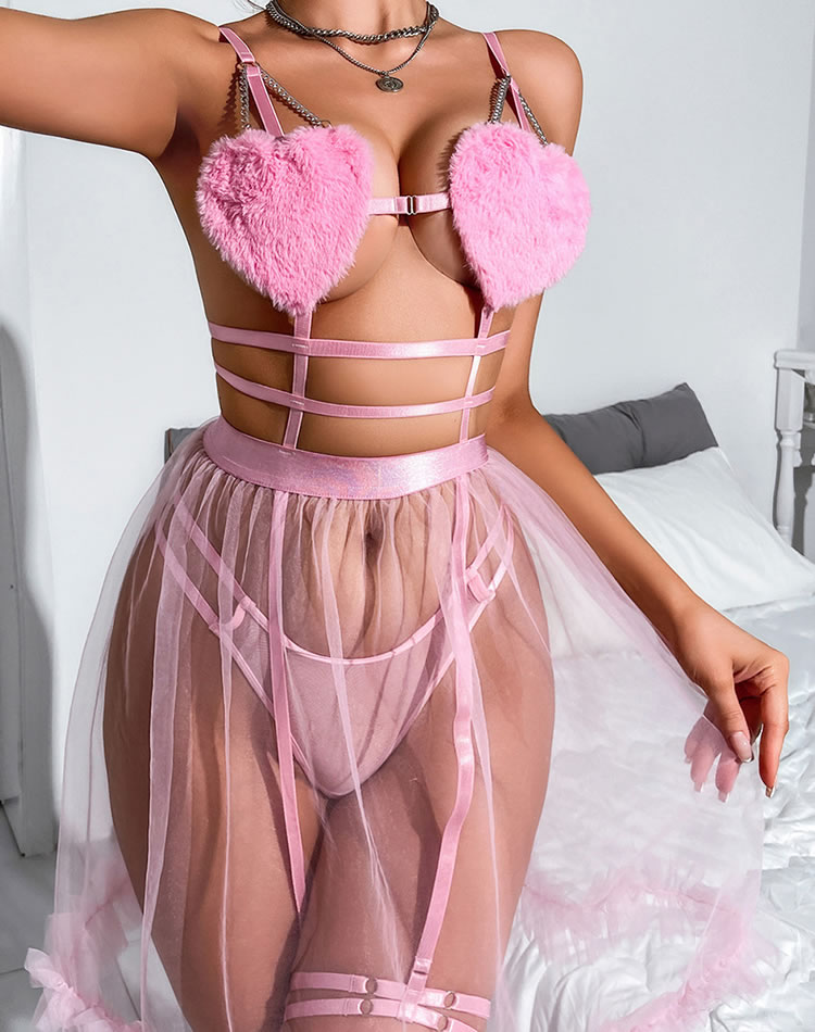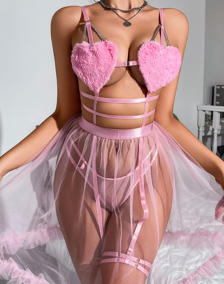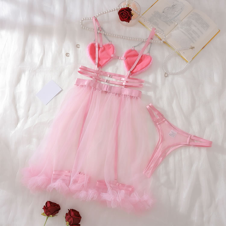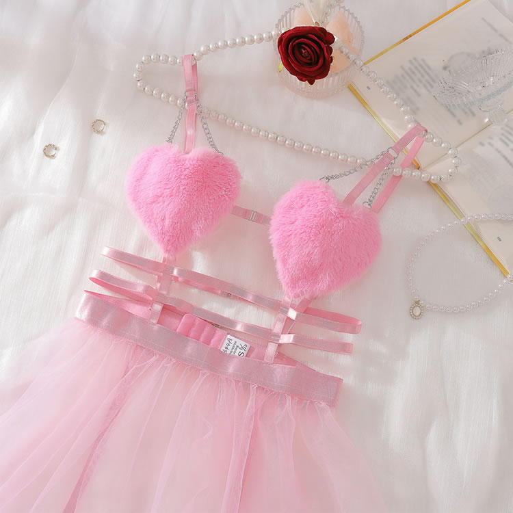 This charming pink lingerie set features fluffy heart-shaped cups that add a touch of whimsy and fun. The sheer fabric and delicate straps create an alluring look, while the tulle skirt with ribbon details enhances its playful charm. Perfect for those who want to feel both cute and confident.