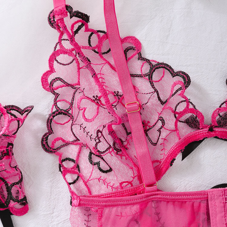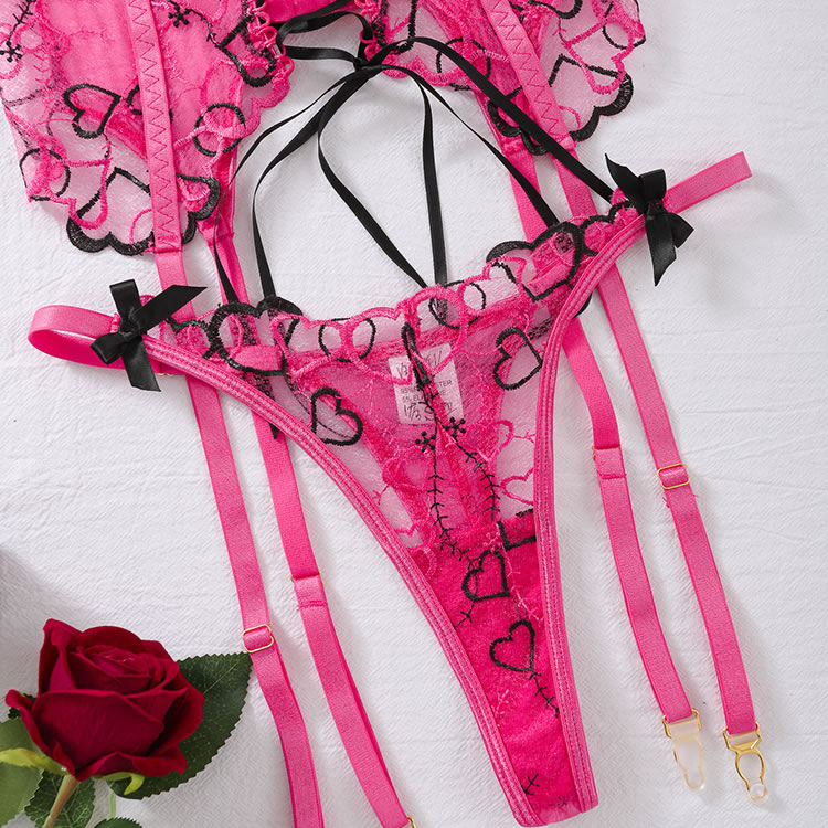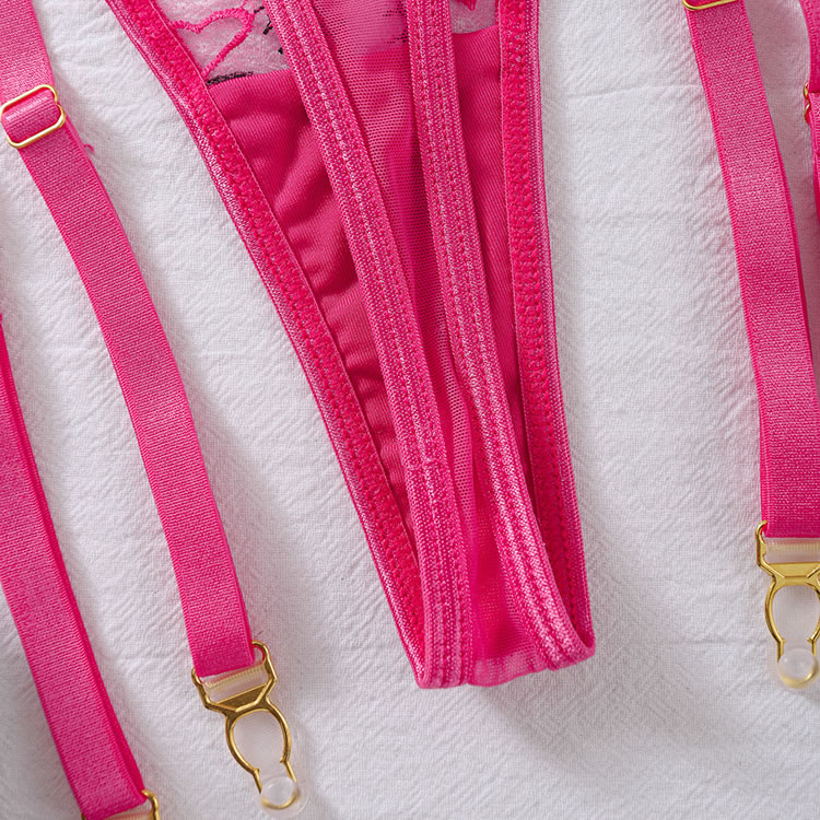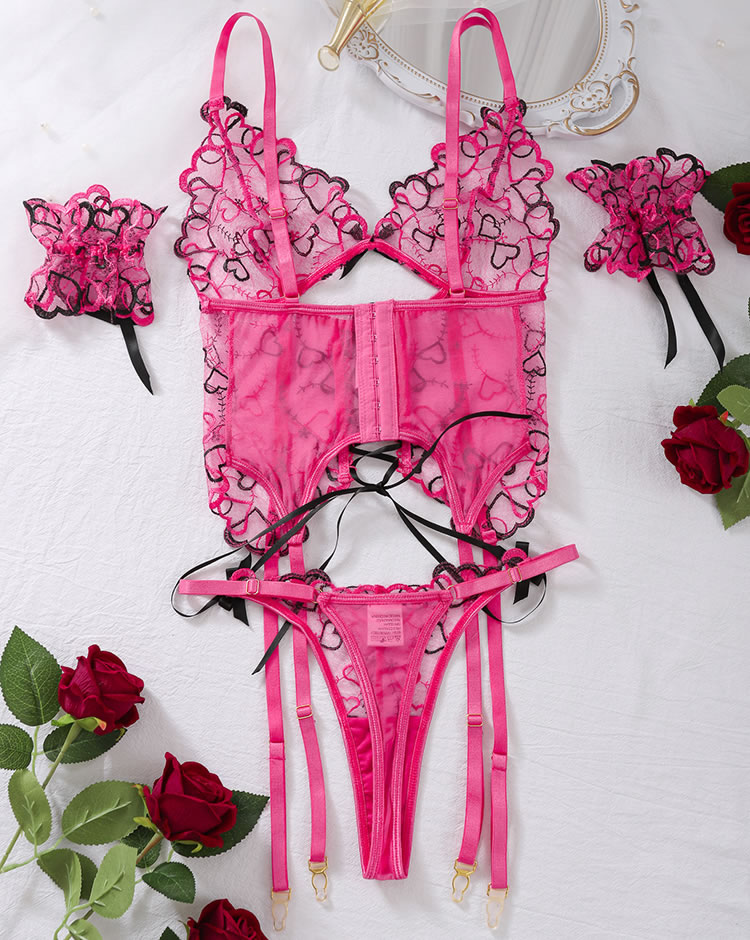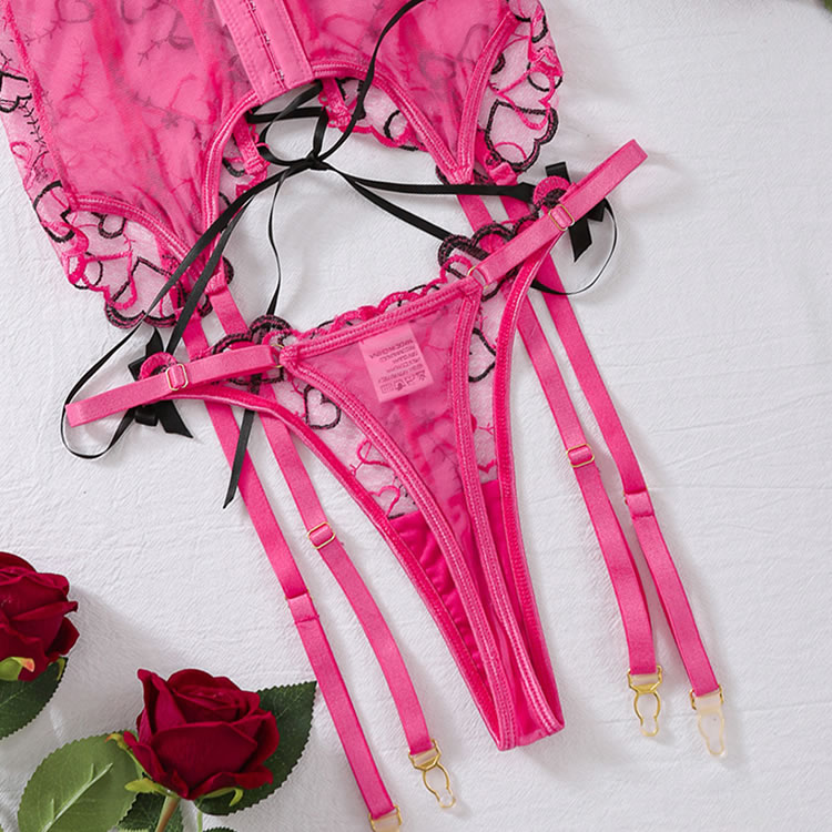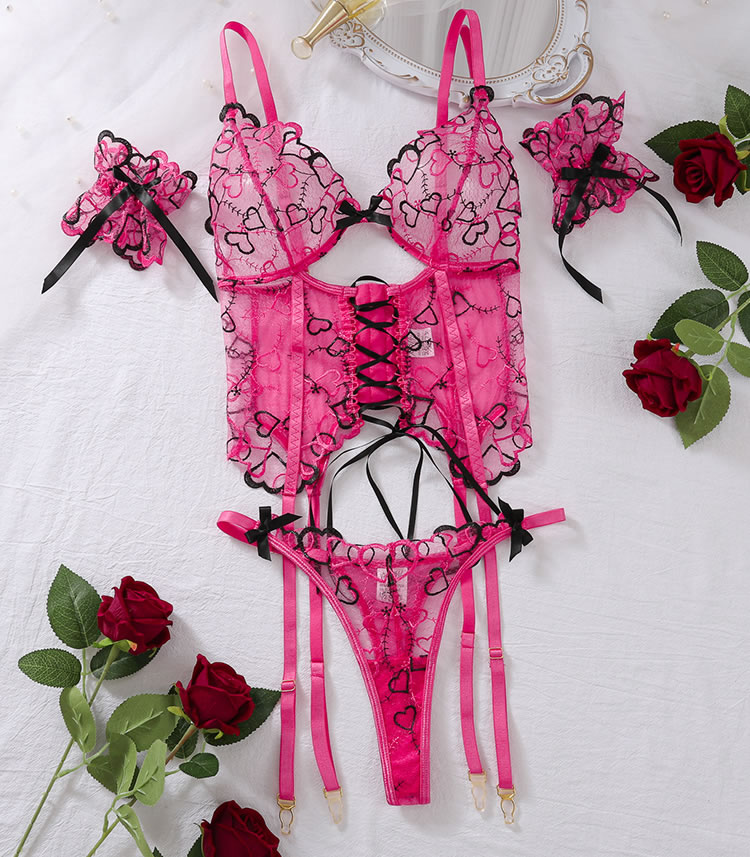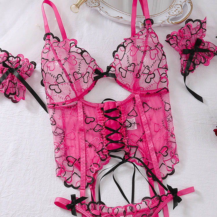 Seduce with a touch of elegance in this mesh bustier set, designed to captivate. It features sheer mesh triangle cups with intricate embroidery, adjustable spaghetti straps, and a hook-and-eye back closure. The sheer mesh bodice and adjustable garter straps enhance allure, complemented by a matching thong panty and wrist cuffs. Perfect for adding a flirty edge to your intimate moments.