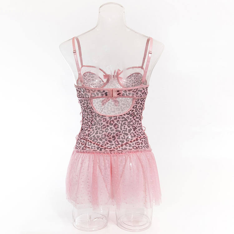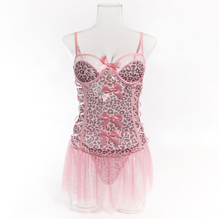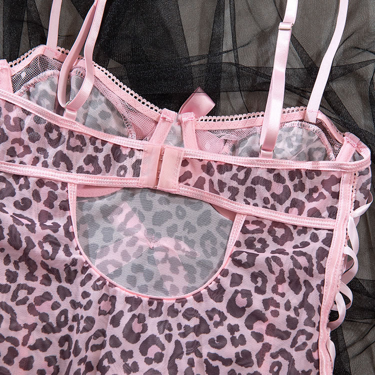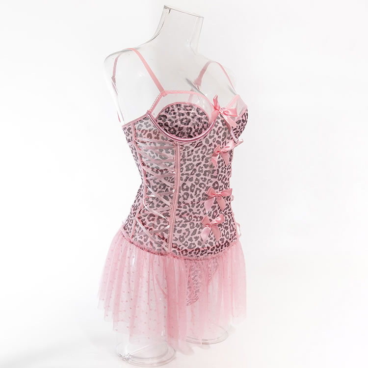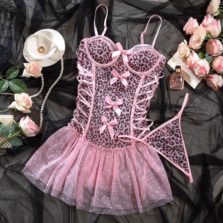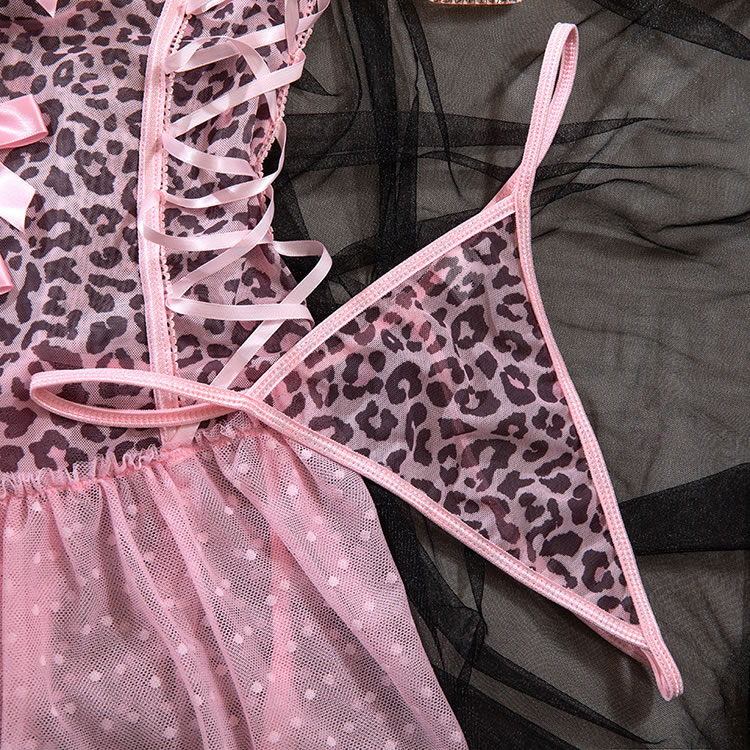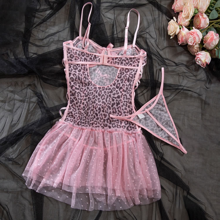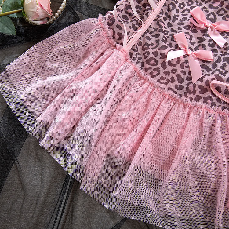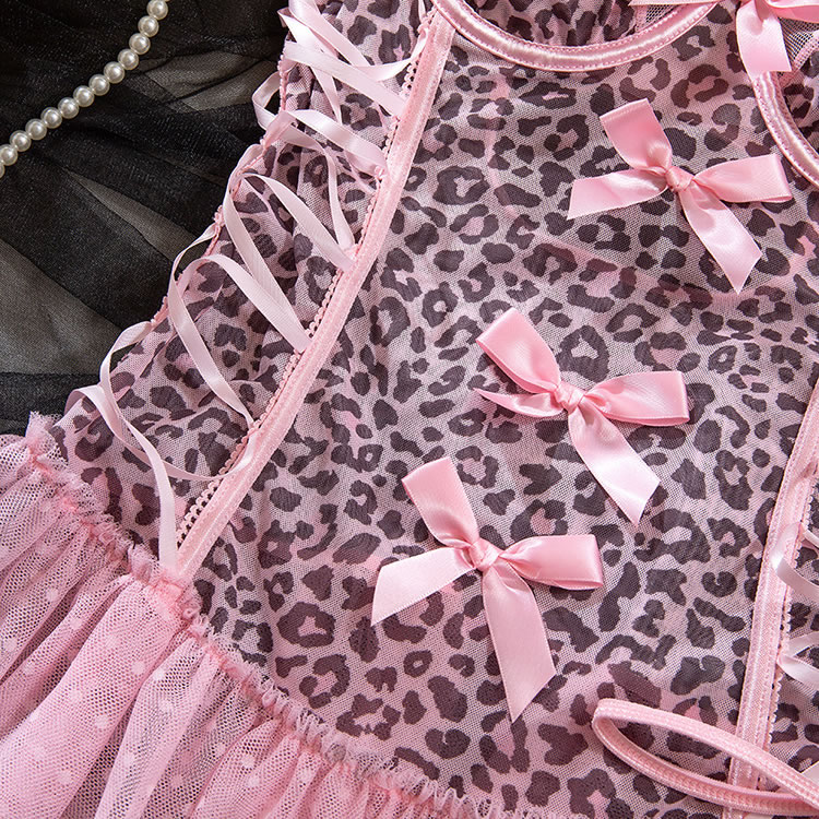 Step into playfulness with this leopard lingerie set. The babydoll showcases a captivating leopard print that enhances its appeal, paired with flirty pink bows and lace-up sides for added charm. The sheer fabric offers a soft and airy feel, while the tutu-style skirt adds a whimsical touch, making it an ideal choice for anyone seeking a blend of confidence and fun in their intimates.