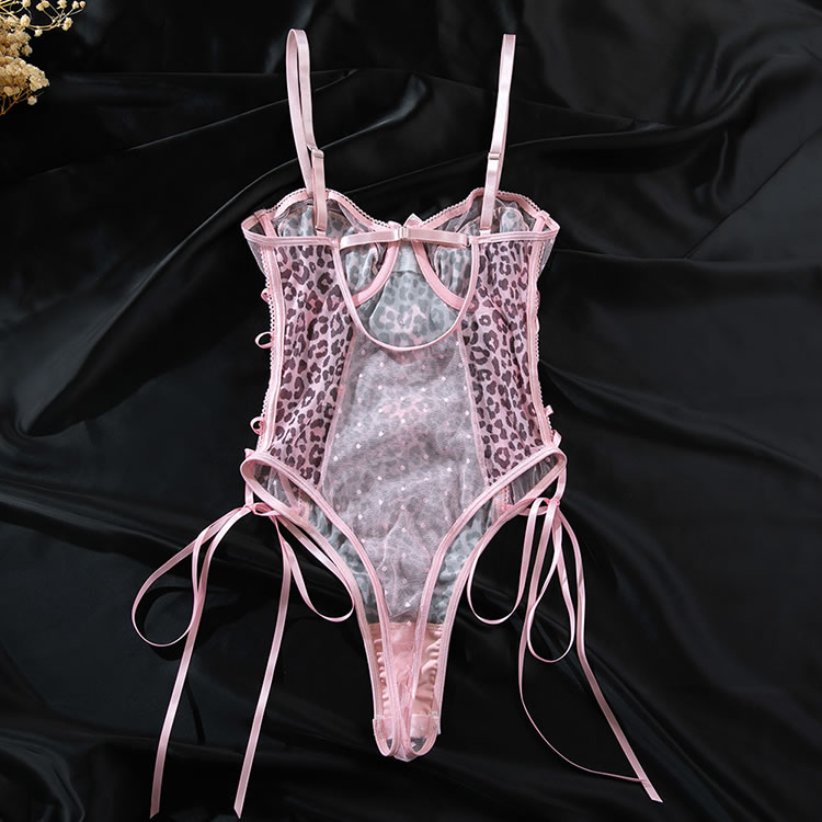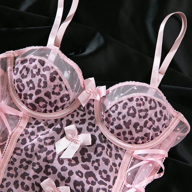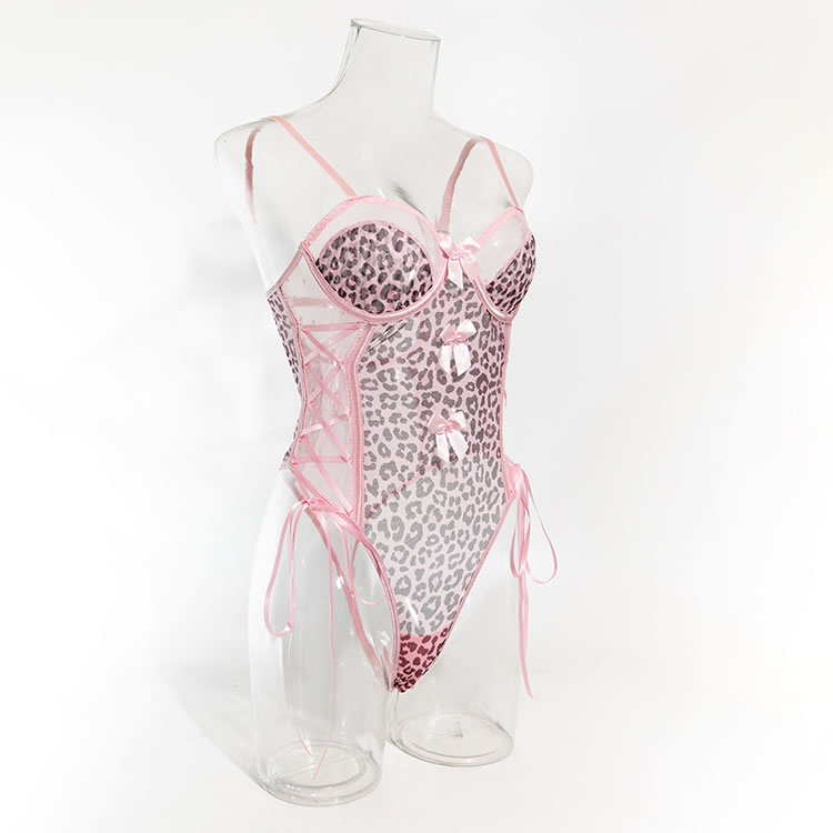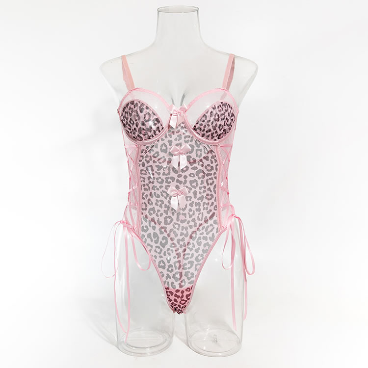 This playful leopard print bodysuit features pink accents and delicate bows that add a touch of charm and style. The combination of bold animal print and soft pink elements ensures both comfort and a flattering silhouette, making it perfect for those who want to feel confident and trendy in their lingerie.