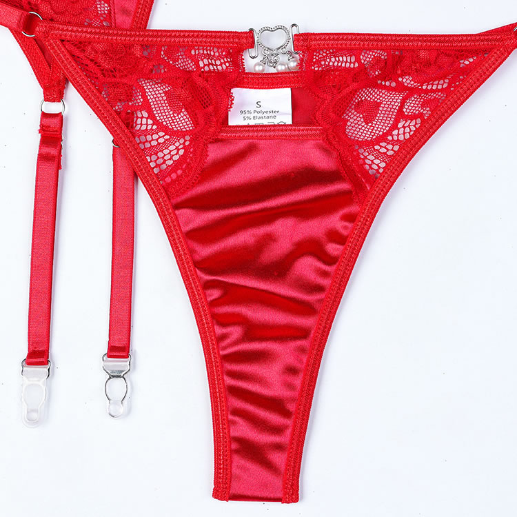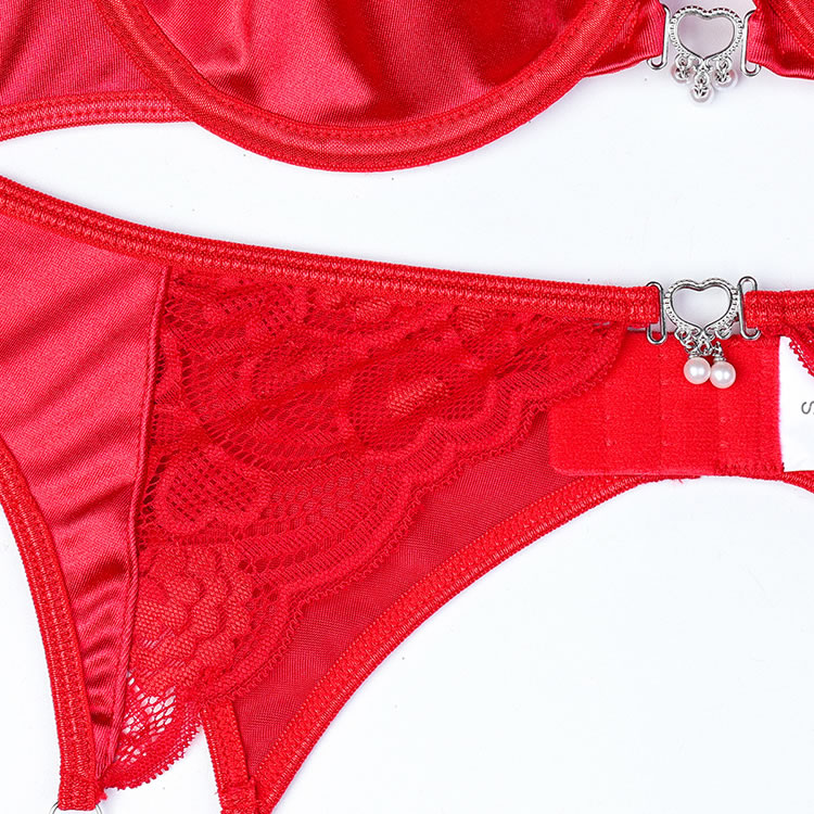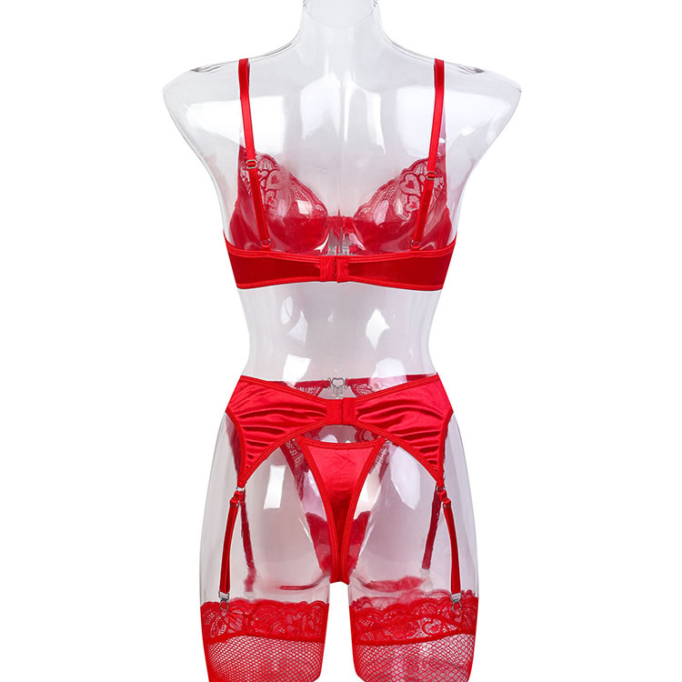 Indulge your deepest desires with this seductive lace bra set featuring delicate underwire cups, adjustable spaghetti straps, and a hook and eye back closure. Paired with a matching high-waisted garter belt with adjustable garter straps, a thong panty, and thigh-high stockings, this set promises to captivate and allure, perfect for an unforgettable night.
