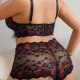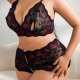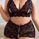 This eye-catching plus-size lingerie set makes a statement with its daring design and vibrant details. The black mesh bralette features red lip print accents across the cups and straps, adding a fun, flirtatious touch. A deep V-neckline with side cutouts enhances the silhouette, while adjustable straps ensure a comfortable fit. Paired with high-waisted shorts that have a front keyhole opening and matching lace trim, this two-piece set celebrates curves with confidence. Designed for those who love to express their personality through fashion, it’s perfect for intimate moments or as a bold addition to your loungewear collection.