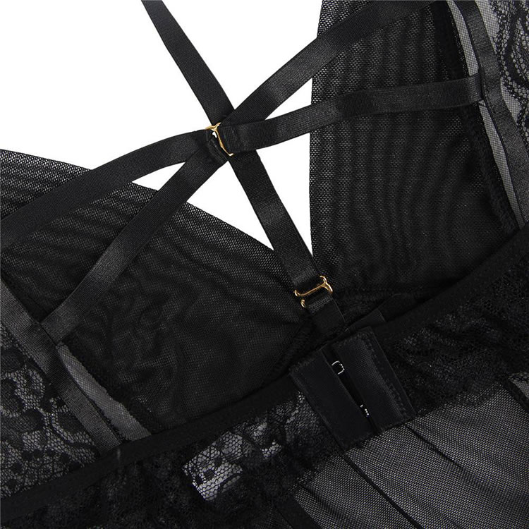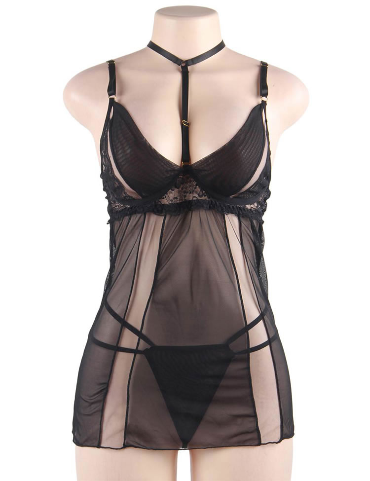Show him your sweet love in this sexy plus size babydoll set featuring sheer mesh soft cups, a choker harness, adjustable shoulder straps, a hook and eye closure, and a matching g-string.